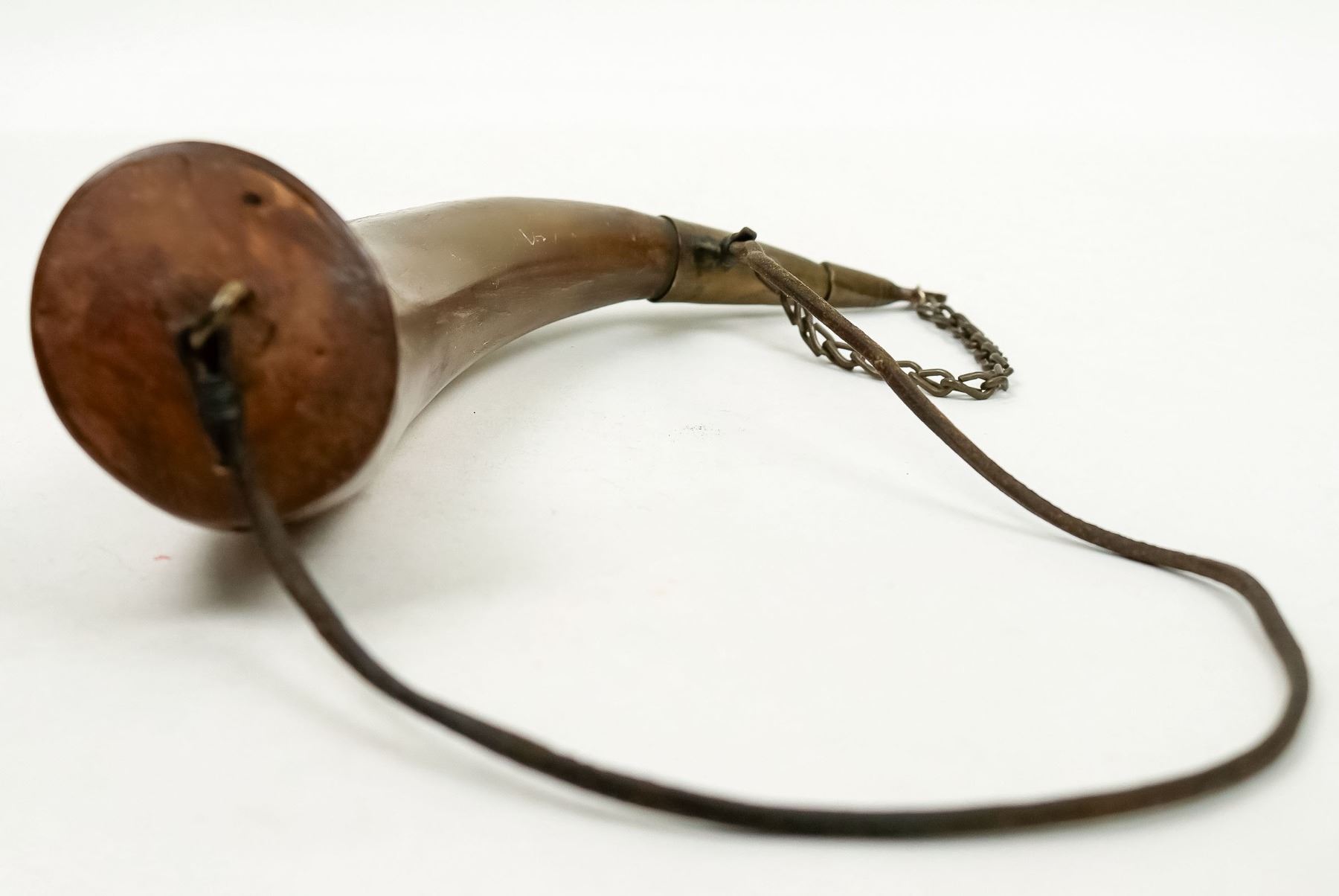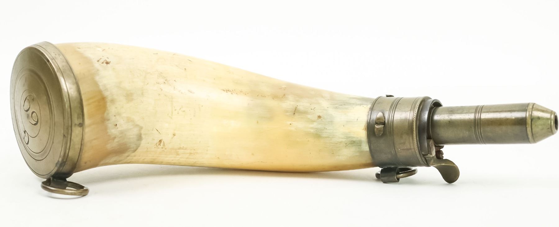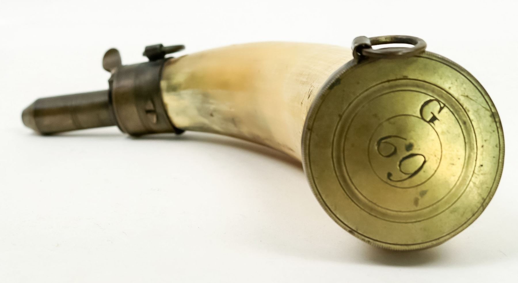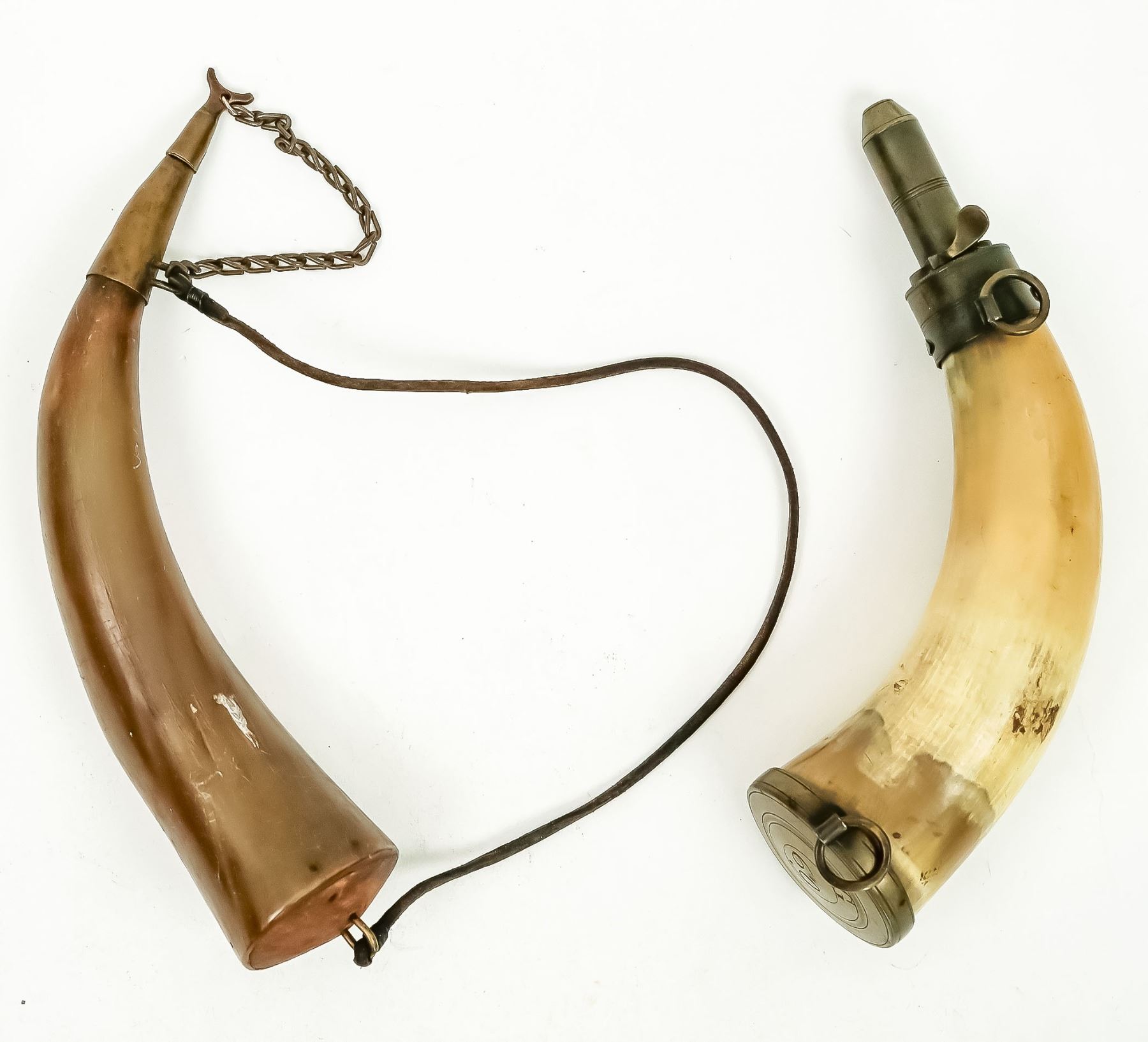 The first horn is light in color with a machined screw spout and release; it has a machined butt cap engraved "G 69". The horn lacks any other British sovereignty markings. It is well constructed and will dispense about 170 grains of black powder or about 2 drams of powder. Because the charge is measured it is not a priming horn. This horn pre-dates the first World War for artillery use with loose powder and would have charged a light artillery piece or a heavy wall gun. In fine working condition from the UK. The second horn is dark in color and hand made. The spout has a brass screw stop and the plug is a hardwood with hand made nails. It is a USA made frontier horn with a capacity for about a third pound of black powder or a day hunter's horn. In very good condition. Both horns are about 10 in. in length. Please see photos for details.