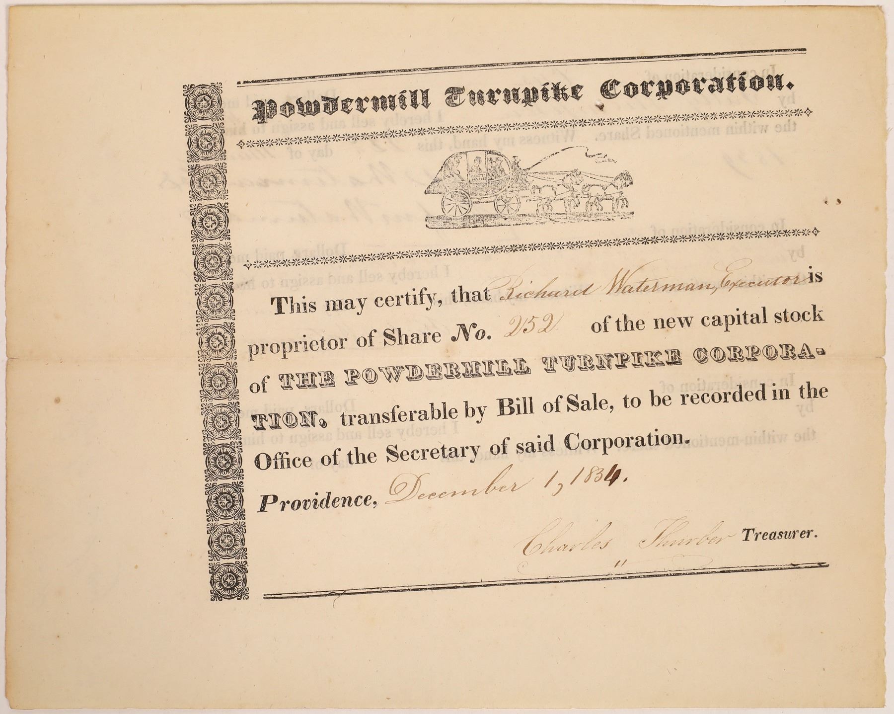 No. 252, issued for one share to Richard Waterman on December 1st, 1834. Signed by treasurer Charles Thurber. Not cancelled. Reverse has notations for stock transfer. Black print and vignette of horse-drawn carriage. Deep horizontal fold. 6.5 x 8.25" In 1810, a petition was granted by the Rhode Island General Assembly to form the Powder Mill Turnpike Corporation, which authorized the construction and improvement of the roadway that ran from Waterman’s Tavern in Greenville, eastward through Johnston and North Providence, ending at the Providence town line. The corporation was so named after a gunpowder mill that once stood in Centerdale about the time of the American Revolution. Unfortunately, the mill met with a tragic end when it was destroyed by a devastating explosion.