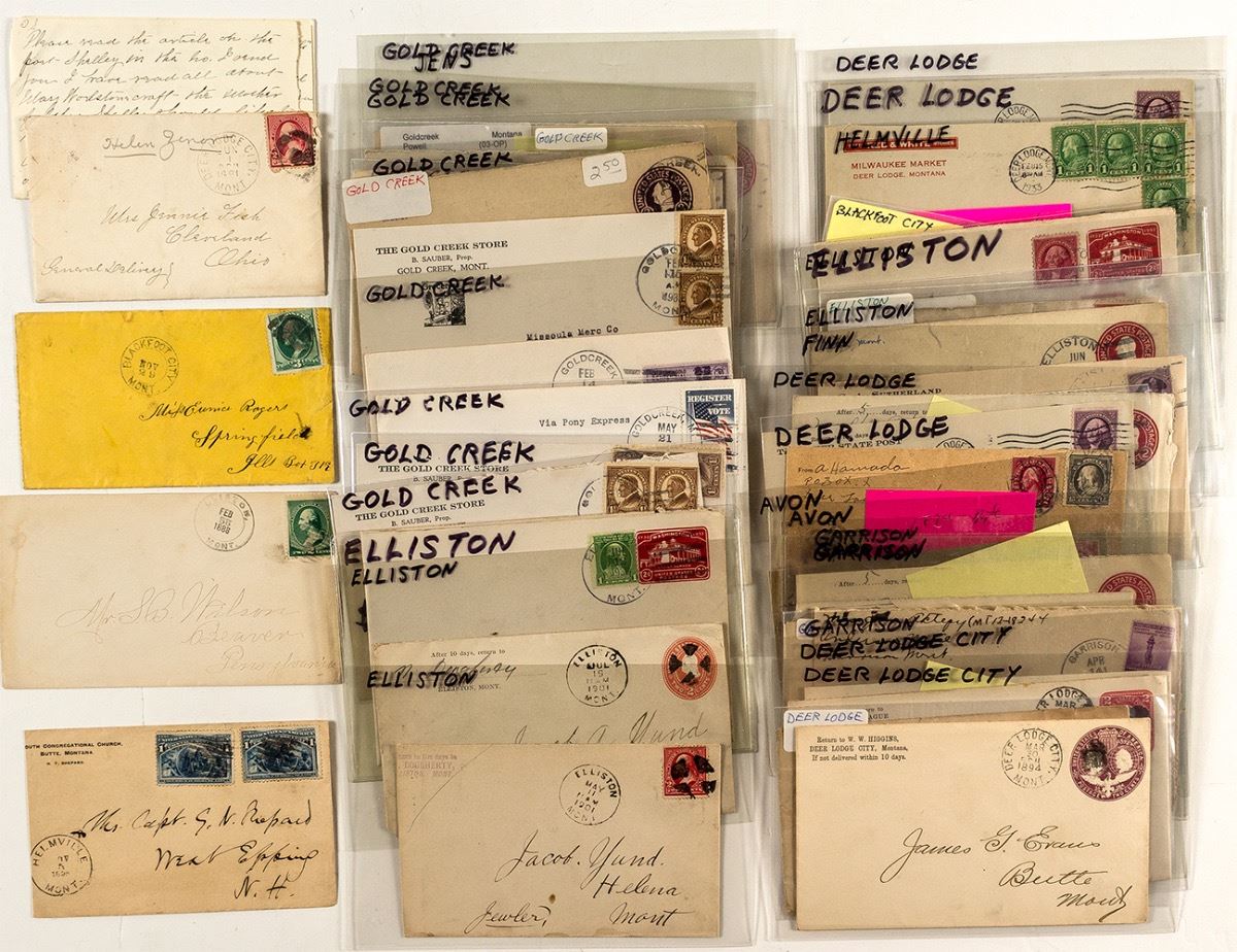 Lot of forty-four. Includes 1891 Deer Lodge City with letter. Blackfoot City c 1860's #1 in Shellen & Dunn. Blackfoot City #2. Two Elliston 1888 (one cover and one postal card) with two different strikes. Two Helmville 1898 and 1901. Also Jens, twelve Gold Creek (Gold Creek pictorial cc), nine Elliston, Finn, Avon, Deer Lodge, Garrison. (Svoboda Collection) City: Powell County State: Montana Date: HWAC# 27979