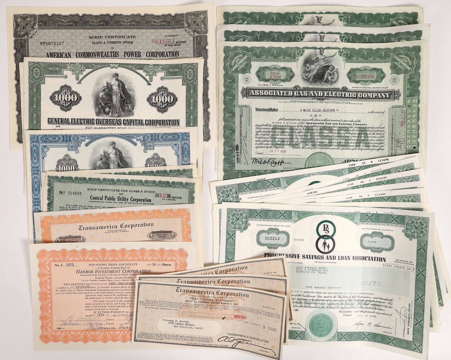 Lot of about 20 pieces. Includes: Transamerica Corporation (fractional warrants, 1929); Central Public Utility Corp. (scrip certificates, 1933); Harbor Investment Corp. (1930); Associated Gas & Electric Co. (1929-36); Progressive Savings & Loan Association (1970s-80s); General Electric (1950s and 60s bonds). 1920s-80s Ken Prag Collection