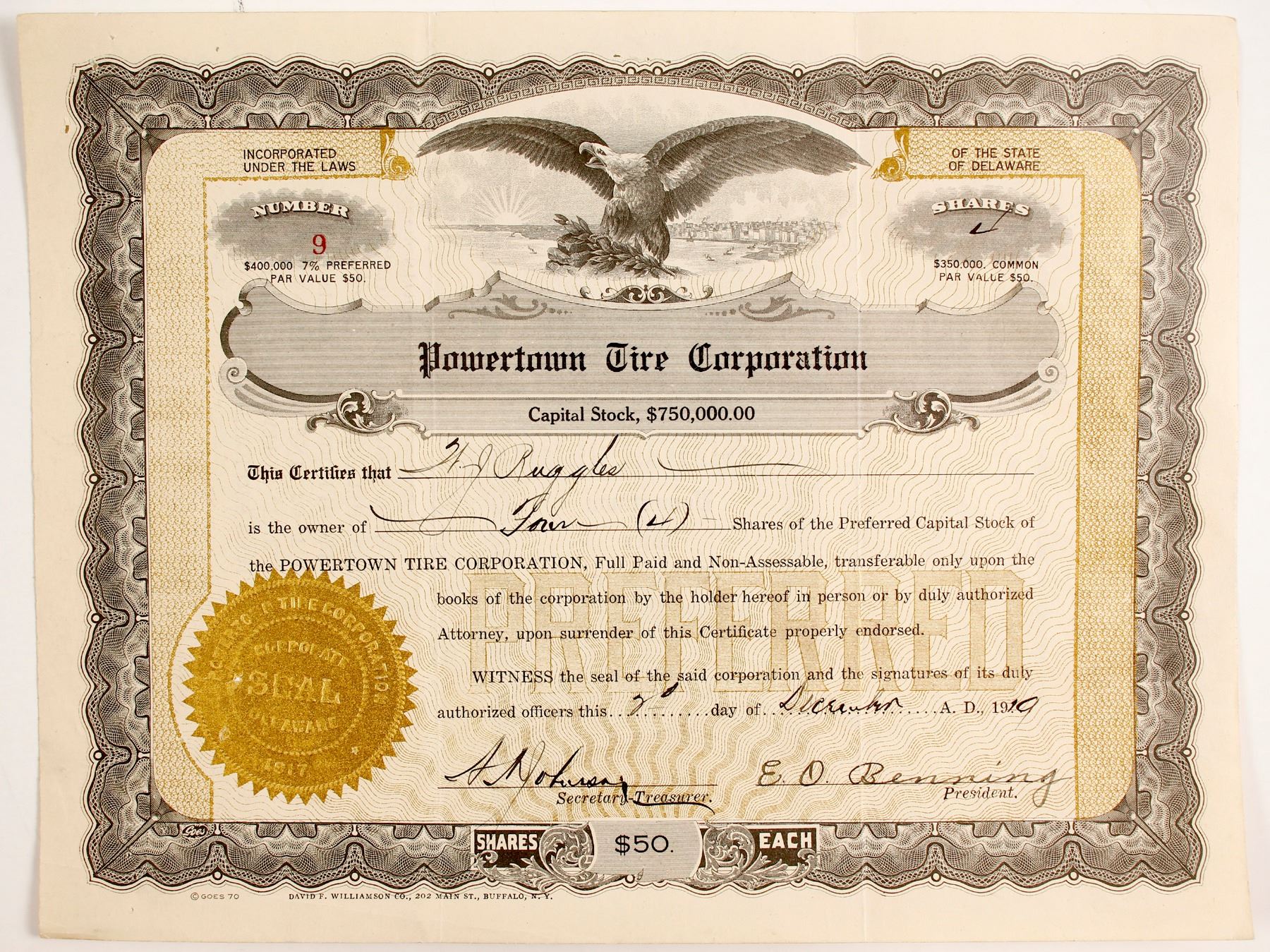 4 shares of Powertown Tire Corp. cert. #9 issued to W. J. Ruggles on Dec 2, 1919. Signed by A. R. Johnson, sec./treas. and E. O Benning, pres. Grey border, beige inner border, gold company seal. Eagle with spread wings, sun and city in background. Inc. under the laws of the state of DE. Powertown Tire Corporation is a NY Foreign Business Corp. filed on Feb. 4, 1921 filing status is Active. Factory is located in Rochester, NY. Business was carried on for a year or two under the name of the Rochester Tire Company. Now manufacturing under their own formula at Rochester. Printed: GOES 70 David F. Williamson Co, 202 Main St, Buffalo, NY. Prag collection.