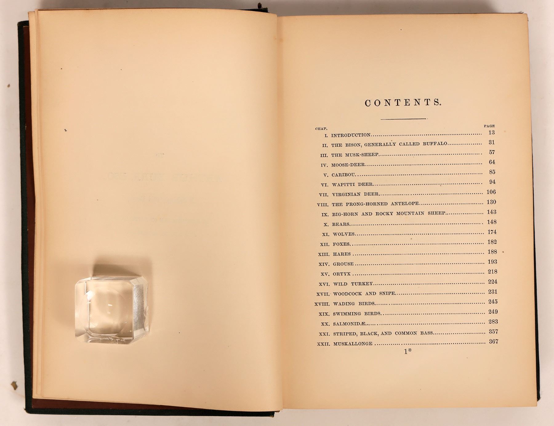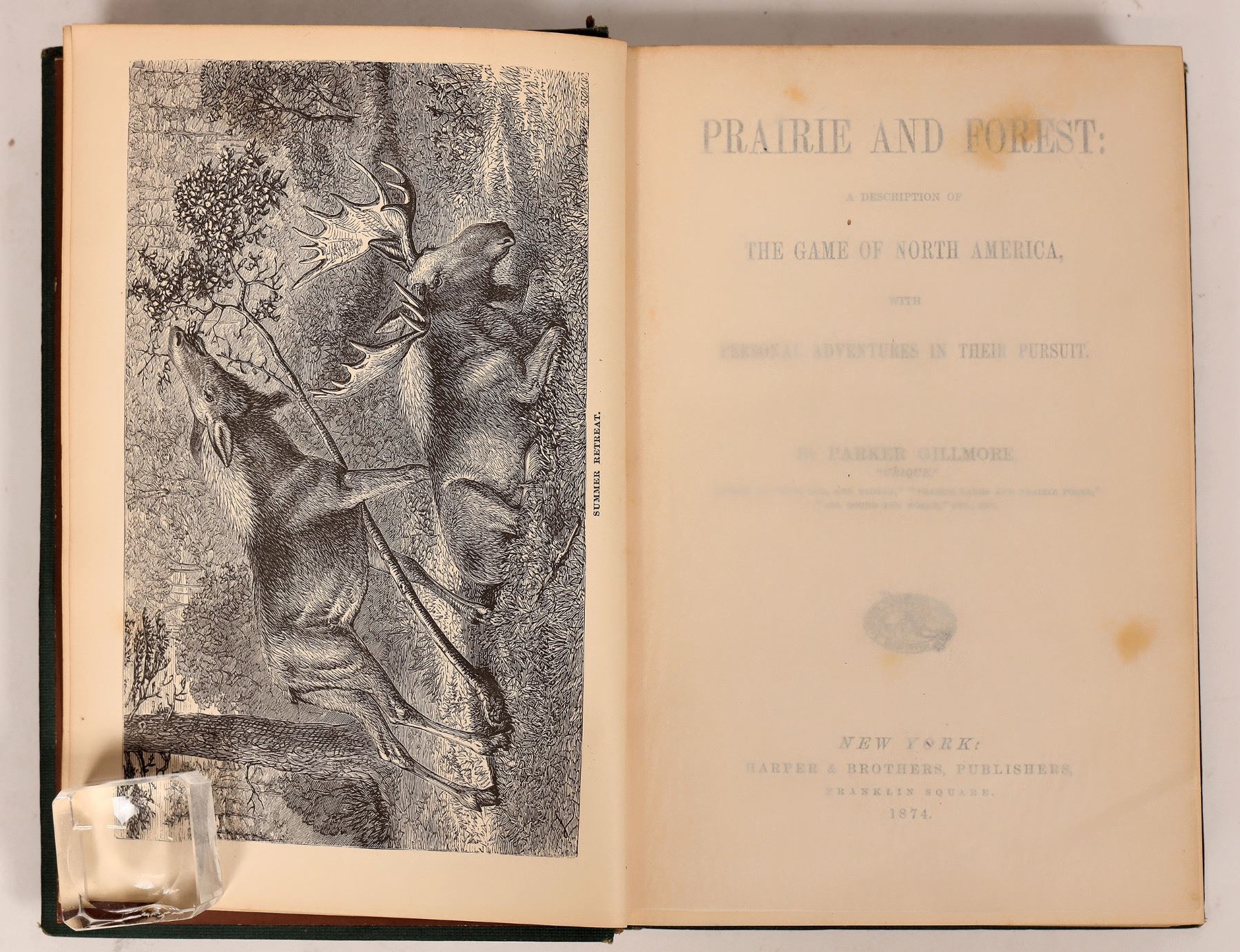 1874 Prairie and Forest: a description of the Game of North America with Personal Adventure in their Pursuit by Parker Gillmore. Bears, hares, elk etc. 378pp, gilted spine with top and bottom wear.