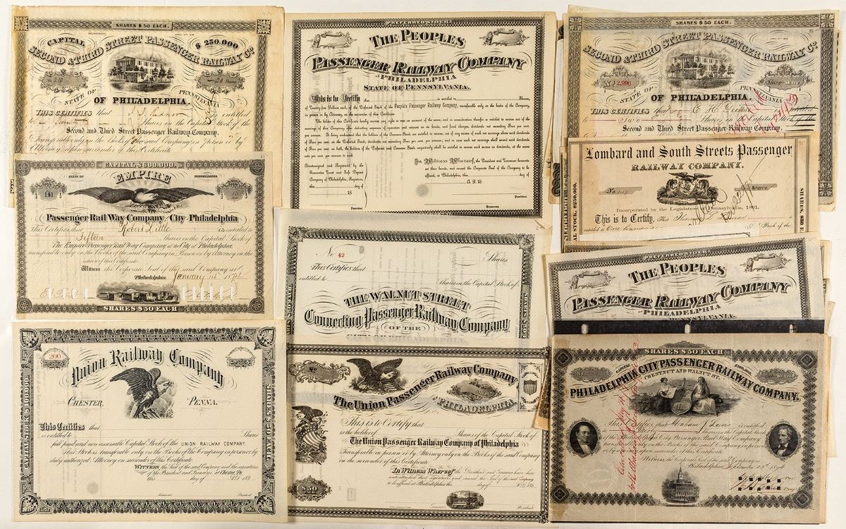 Lot of 22, issued and unissued. Some are pictorial, but no railroad vignettes. Issued: Philadelphia & Baltimore Central Railroad (1856 & 1857, not cxl), Philadelphia City Passenger Railway Co. (1872 & 1876, punched), The People's Passenger Railway Co. (two diff. 1882, cxl), Second & Third Street Passenger Railway Co. (1859, 1882 & 1884, cxl), Continental Passenger Railway Co. (1881, 1883 & 1884, cxl), Empire Passenger Railway Co. (1874, cxl), Philadelphia Traction Co. (1891, cxl), Frankford & Southwark Philadelphia City Passenger Railroad (1878, cxl), Lombard & South Streets Passenger Railway (1870 & 1873, cxl), plus early unissueds. Please inspect. (Prag Collection) City: Philadelphia State: Pennsylvania Date: 1856-1891 ID# 34577