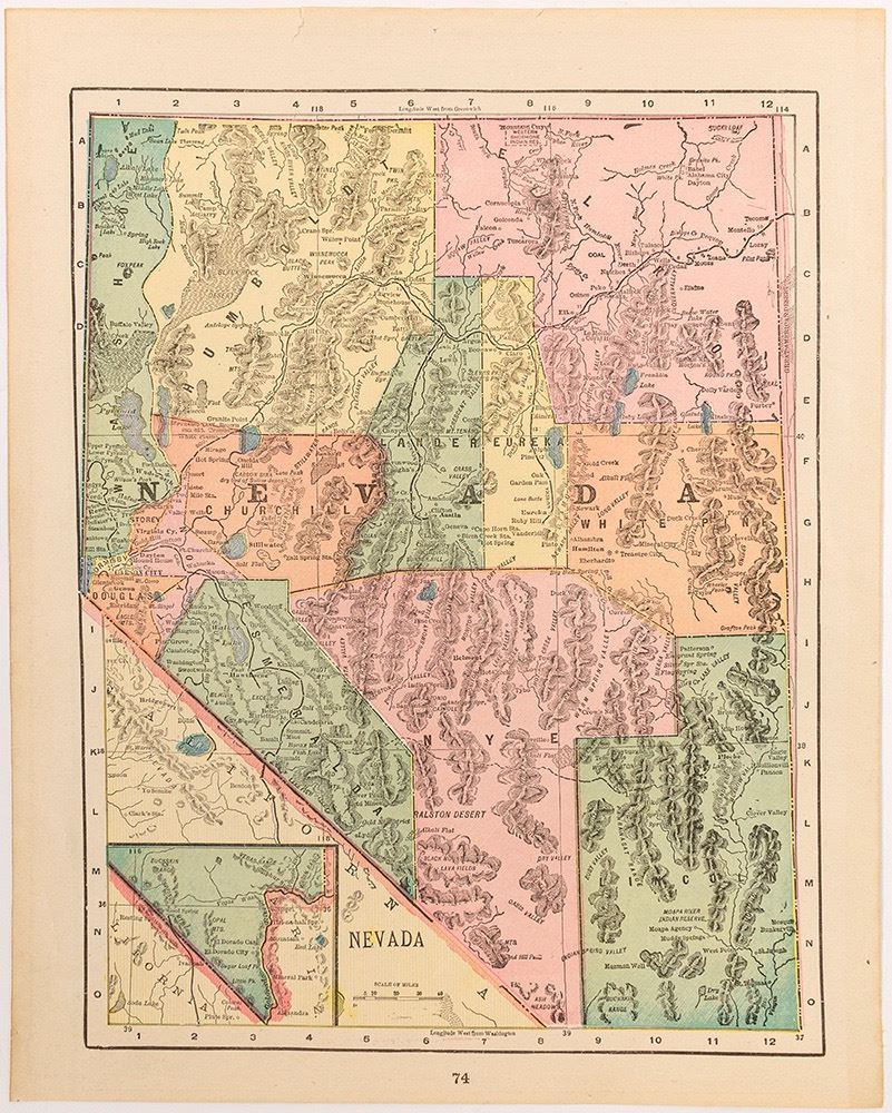 Dated by the absence of Clark County. Probably turn of the Century. Basalt is listed. Had a post office in 1906. Canon City is listed. Lost its post office in 1867. Hand colored. 13.5 x 11". Excellent condition. (Al Adams Gold Rush Memorabilia Collection) Date: Location: Nevada HWAC# 55039