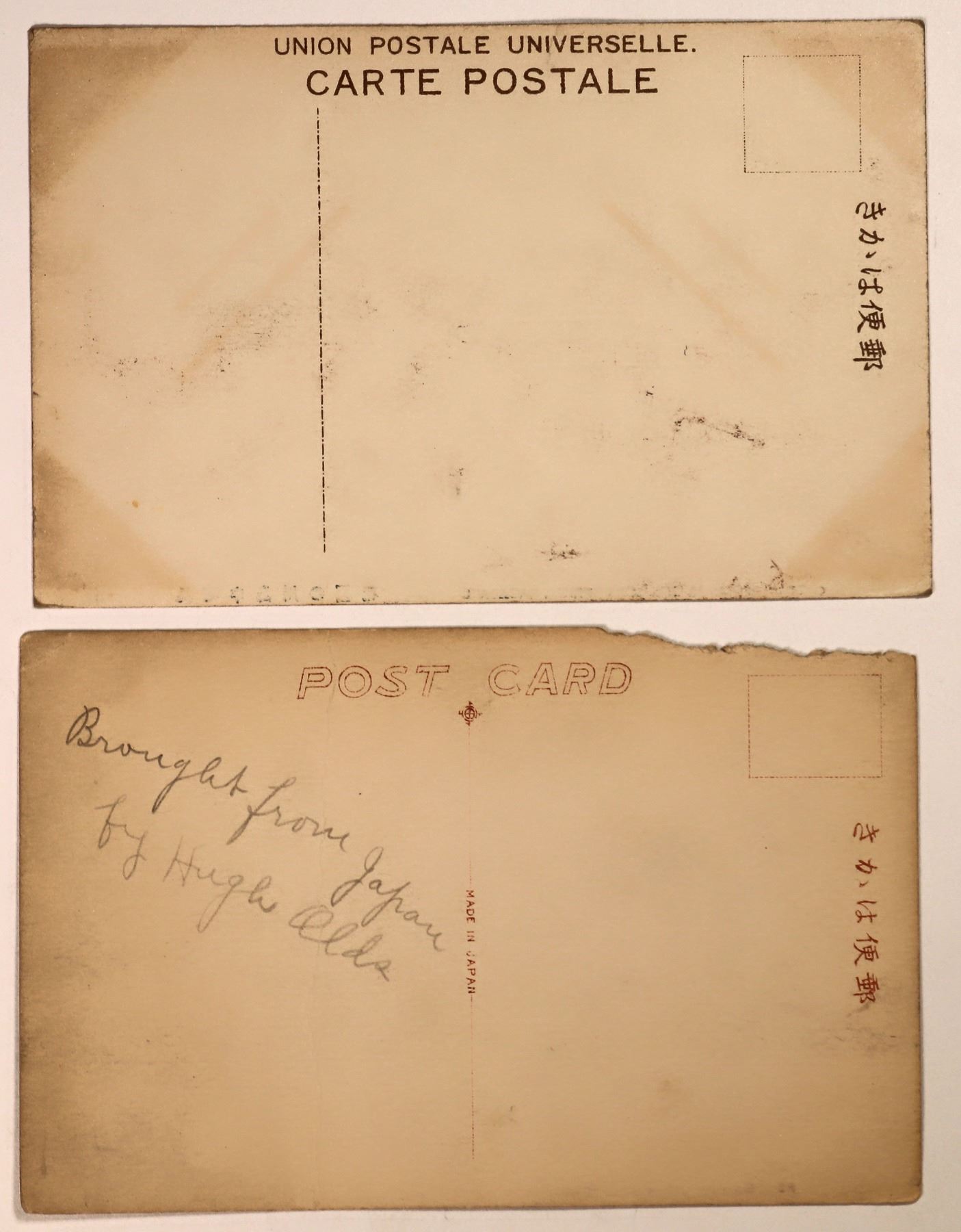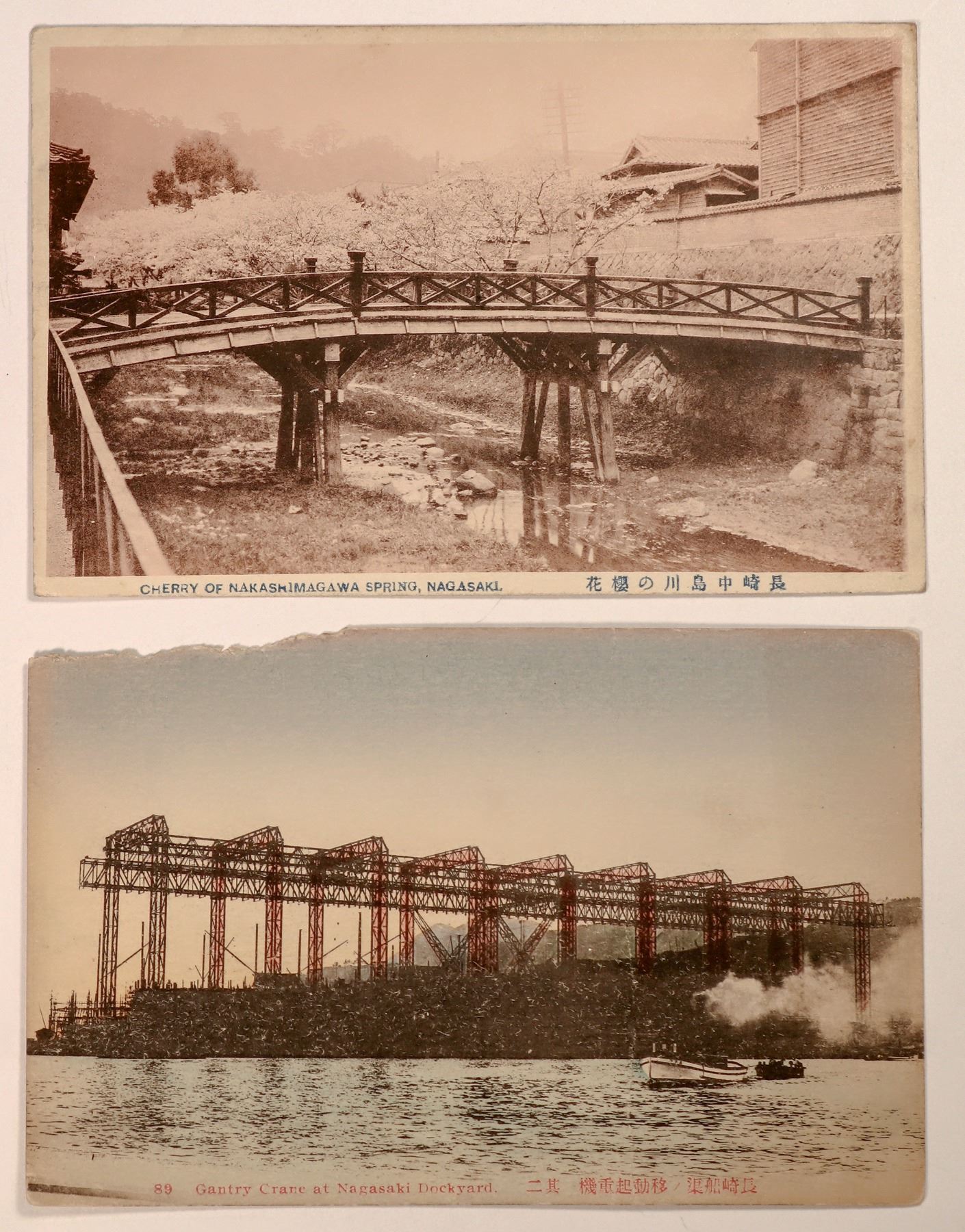 2 rear Nagasaki bridge postcards. Both likely destroyed in the WW 2 nuclear bombing. Gantry crane has upper left paper loss.[ Nagasaki Japan