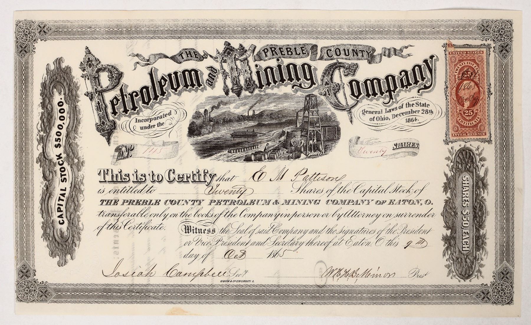 This Ohio stock is #145 for 20 shares to EM Pattisome on October 9, 1865. Signed by president Bettimon and secretary Campbell. Oil field vignette located on two sides of a River. Printer was Gibson of Cincinnati. 25c Certificate revenue stamp. Stamped seal. Two vertical folds. No edge, corner, discoloration or pin hole issues. Extremely nice.