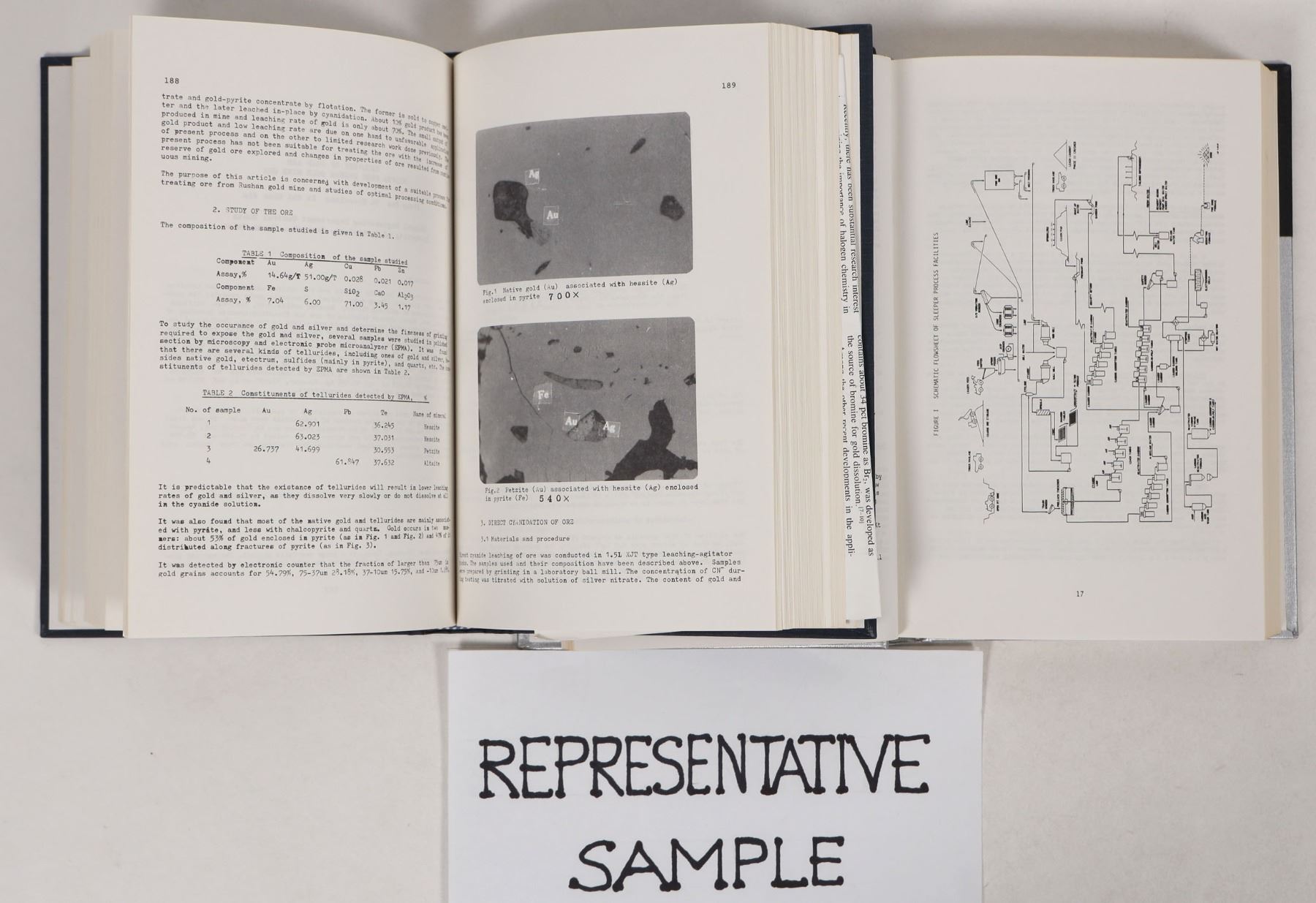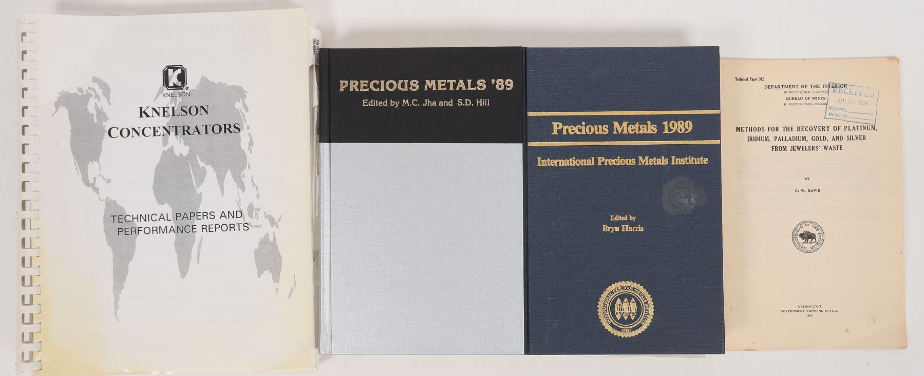 A group of three books and a booklet on the extraction and processing of precious metals, dating from 1924 to 1994. The booklet is "Methods for the Recovery of Platinum, Iridium, Palladium, Gold and Silver from Jewelers' Waste" (1924) by C.W. Davis. The books are "Precious Metals '89" by M.C. Jha and S.D. Hill, "Precious Metals 1989"by Bryn Harris for the International Precious Metals Institute, and a collection of technical papers from Knelson Concentrators about a variety of mines. All in good condition; minor wear and toning on the C.W. Davis Booklet.