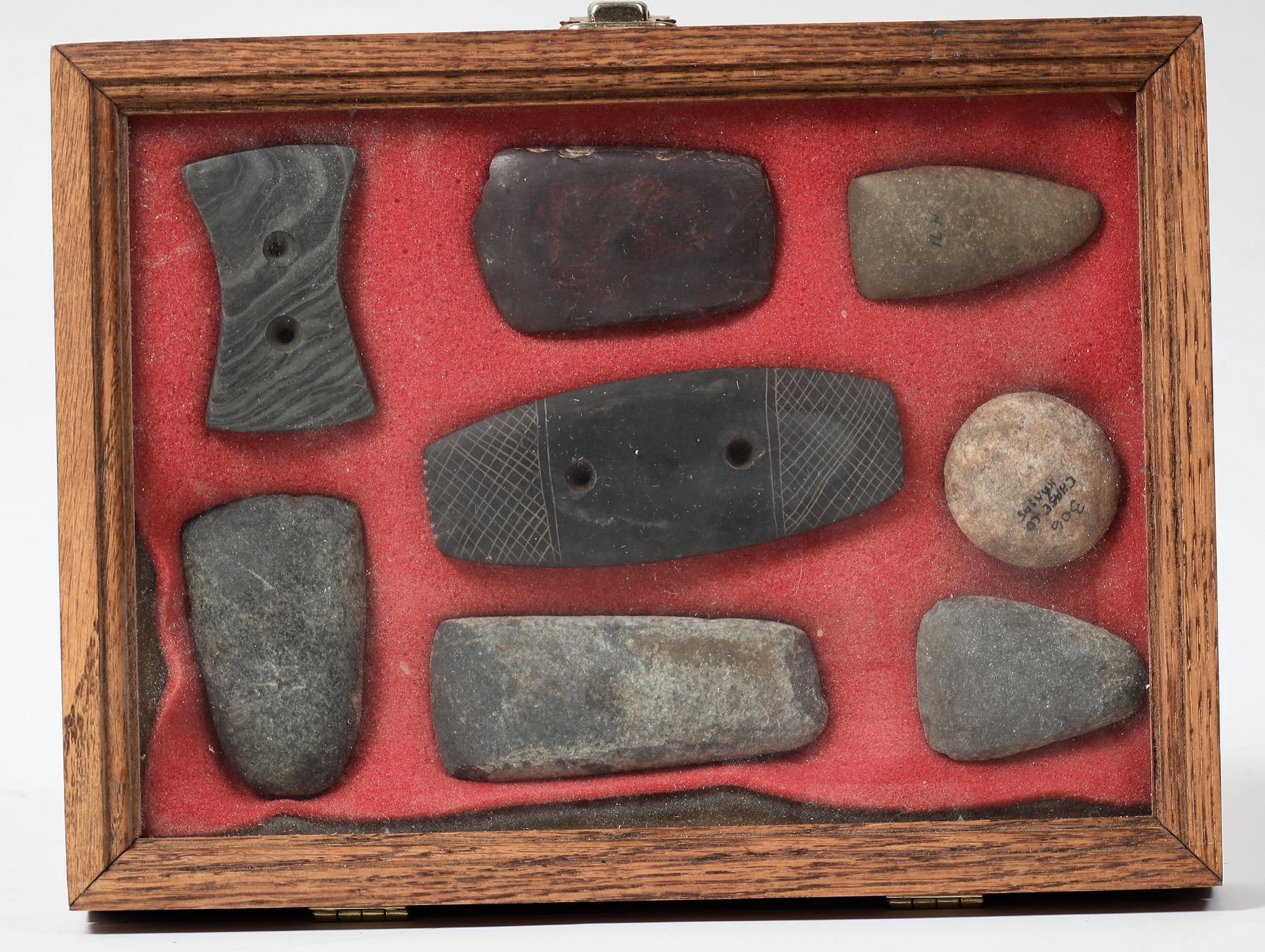 This lot is unique with two rare find tablets and six implements. The larger of the two tablets has two drilled holes, single concave perforations, with 13 hash marks total on the ends, 5 in./ 127 mm of black slate; origin unknown. The smaller tablet is bowtie shaped, 3 in./ 77 mm with two tone gray slate and two bi-concave perforations. Found in Delaware County, Indiana. The other six pieces show signs of polish use 1.75 in./ 44 mm to 4 in./102 mm. From the Gary Bracken collection. Please see photo for details. (ref. Prehistoric Implements, Behnken 1983, pp. 222-223).