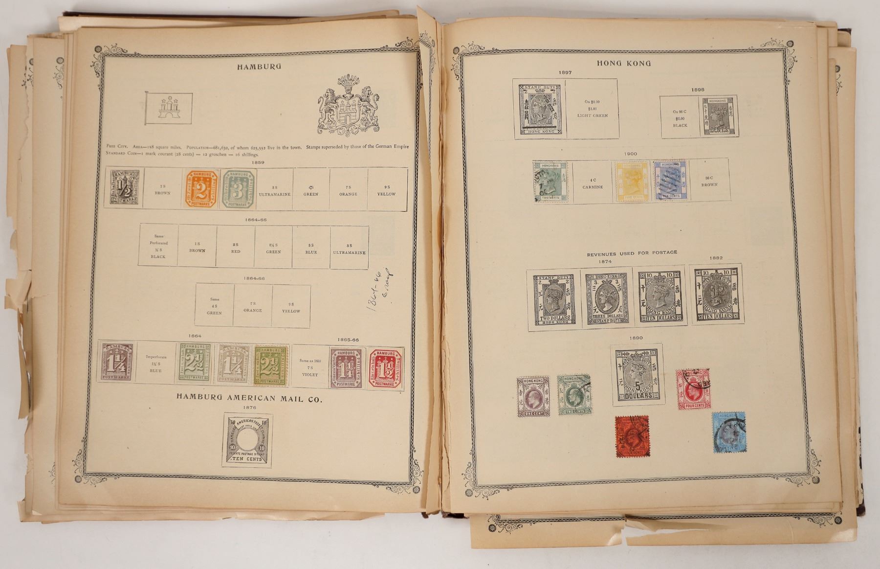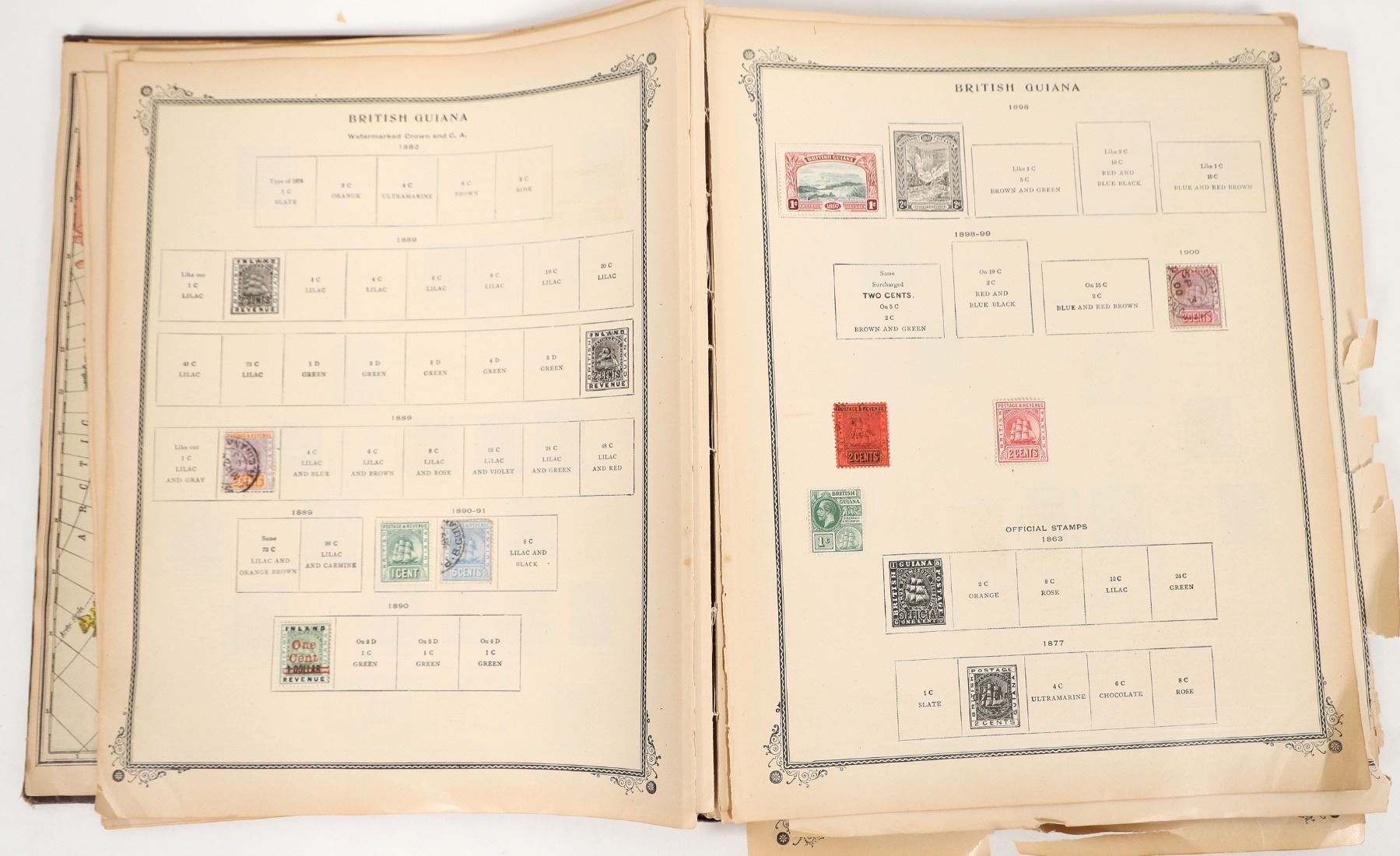 Rare, really good early postage stamp album, many rarities, 100s, perhaps from 100 countries, almost entirely pre-1900. Album contains what's left after some of the pages have been split out by countries separately. "The International Postage Stamp Album-Nineteenth Century," Bogert & Durbin Co., New York, copyright 1902. First owner's name penned inside fly leaf page, "Harry F. Mitchell, April 1st, 1908," with second owner's name typed above, "Thos. L. Mitchell, Philatelist. Pleasantville. Pa., U.S.A." Includes 8 maps of the world, published by The Scott Stamp & Coin Co., Limited, in the office of the Librarian at Washington, 1893. 11.5" x 9" each. Album is in poor condition, but it's what's inside that counts.