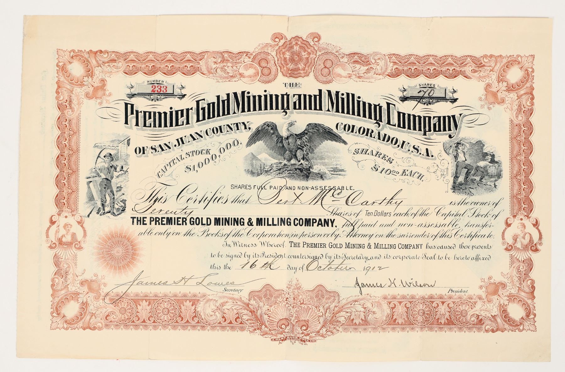 "of San Juan County, Colorado." No. 233, issued for 70 shares in 1912. Signed by president Wilson and secretary Lowes. Not cancelled. Three vignettes. Deep folds, separation along center fold.