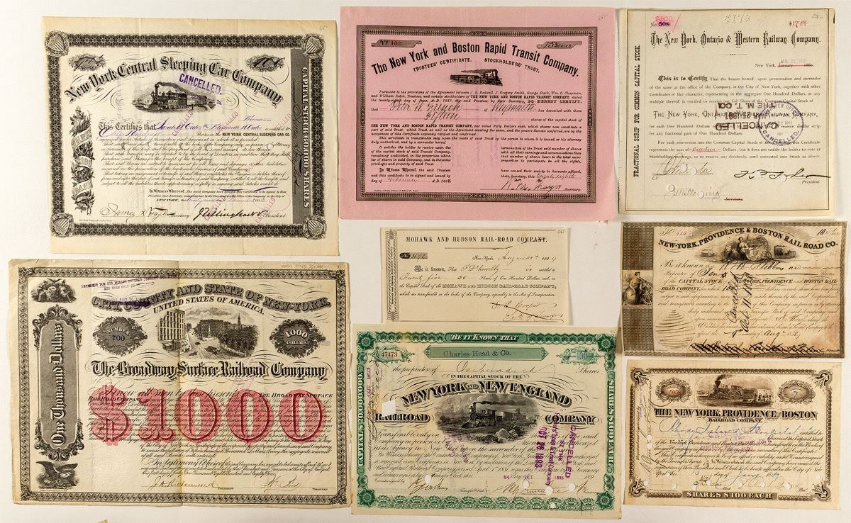 Lot of eight. Includes two very early pieces: New-York, Providence & Boston Railroad Company (1838 stock, pen cancelled, illustrated); and Mohawk & Hudson Rail-Road Company (1839, pen cancelled). Also: an 1884 $1,000 bond for The Broadway Surface Railroad Company with a vignette of early Times Square (stamp cancel, tape repairs); New York Central Sleeping Car Company (1883, punch and stamp cancelled, vignette); New York & Boston Rapid Transit Company (1888, not cancelled, vignette); New York, Providence & Boston Railroad Company (1889, punch and stamp cancelled, vignette); New York & New England Railroad Company (punch and stamp cancelled, vignette); and New York, Ontario & Western Railway Company (1901, stamp and punch cancelled). (Prag Collection) City: State: New York Date: 1838-1901 hwac# 34631