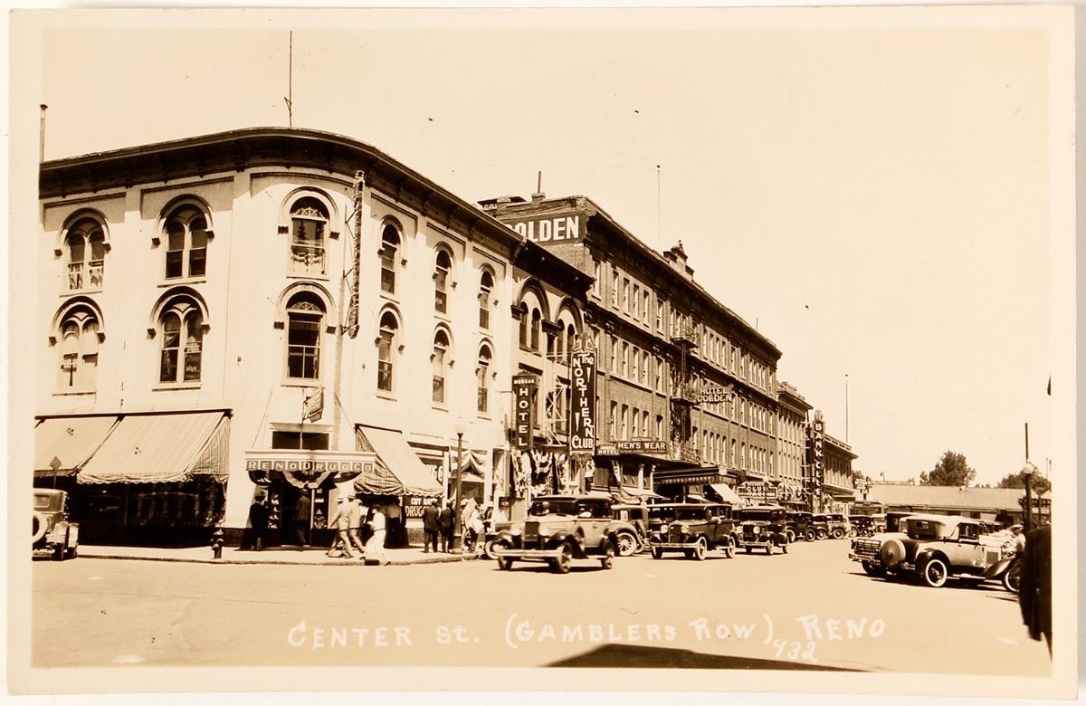 Features the Hotel Golden and Bank Club. Also the Reno Drug, Morgan Hotel, Northern Club, Commercial Hotel, City: Reno State: Nevada Date: ID# 44927