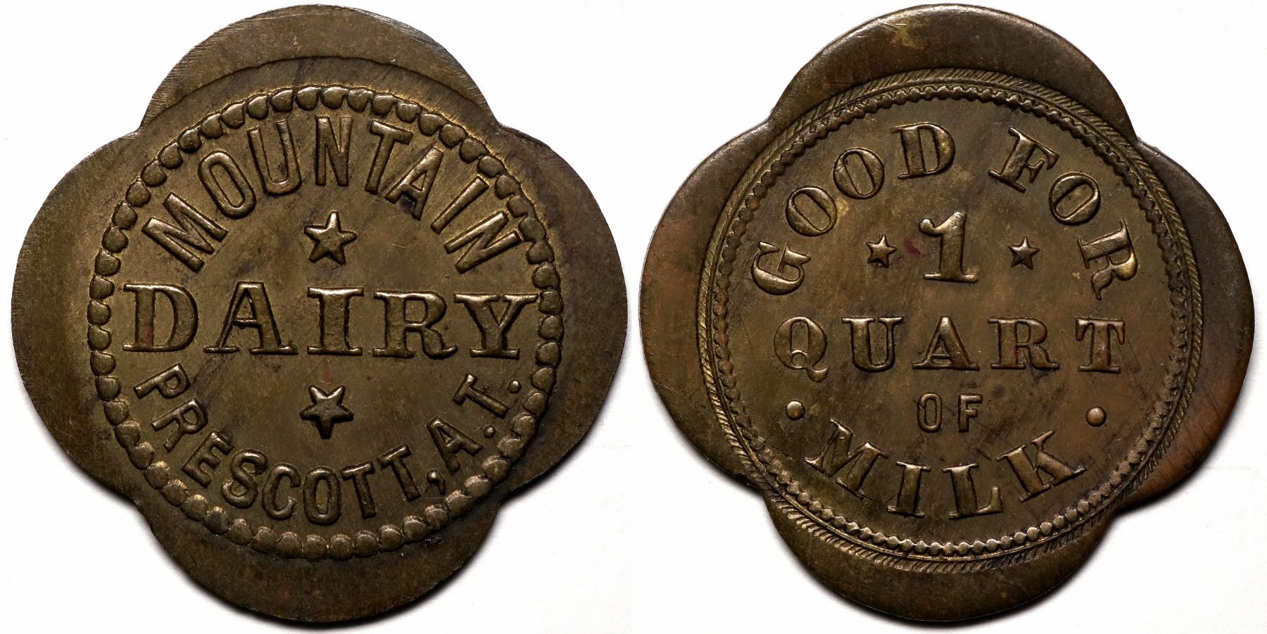 Mountain / Dairy / Prescott, A.T. // GF / 1 / Quart / Of / Milk. Brass, Scalloped, 23mm. R-10. Another eye catcher from the Arizona Territory town and first capital, Prescott.