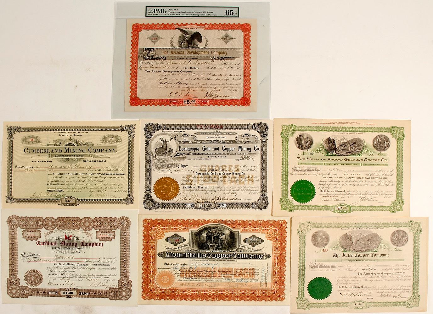 Lot of 7. The best piece is the Arizona Development Company. Grade 65 - Gem Uncirculated by PMG. 1901. 2) Cornucopia Gold & Copper. Number 20 for 14,999 shares to the company. Really nice specimen for a different stock where it is sold to the company. 3) Cumberland. Number 46. 1900. Excellent condition. 4) Mount Title Copper. 1908. Number 95. Again, in excellent condition. 5) Azter Copper. 1910. Great specimen. 6) Heart of Arizona Gold & Copper. 1907. Another great cert. 7) And perhaps the most striking - Cardinal Mining Company. Title in red with a bright red Cardinal on top. 1908. Like any of these - no edge, corner, color or pinhole issues. Those that do not meet this standard, are darn close! (Laguna Collection) HWAC# 62978 Date: Location: Yavapai, Prescott, Arizona