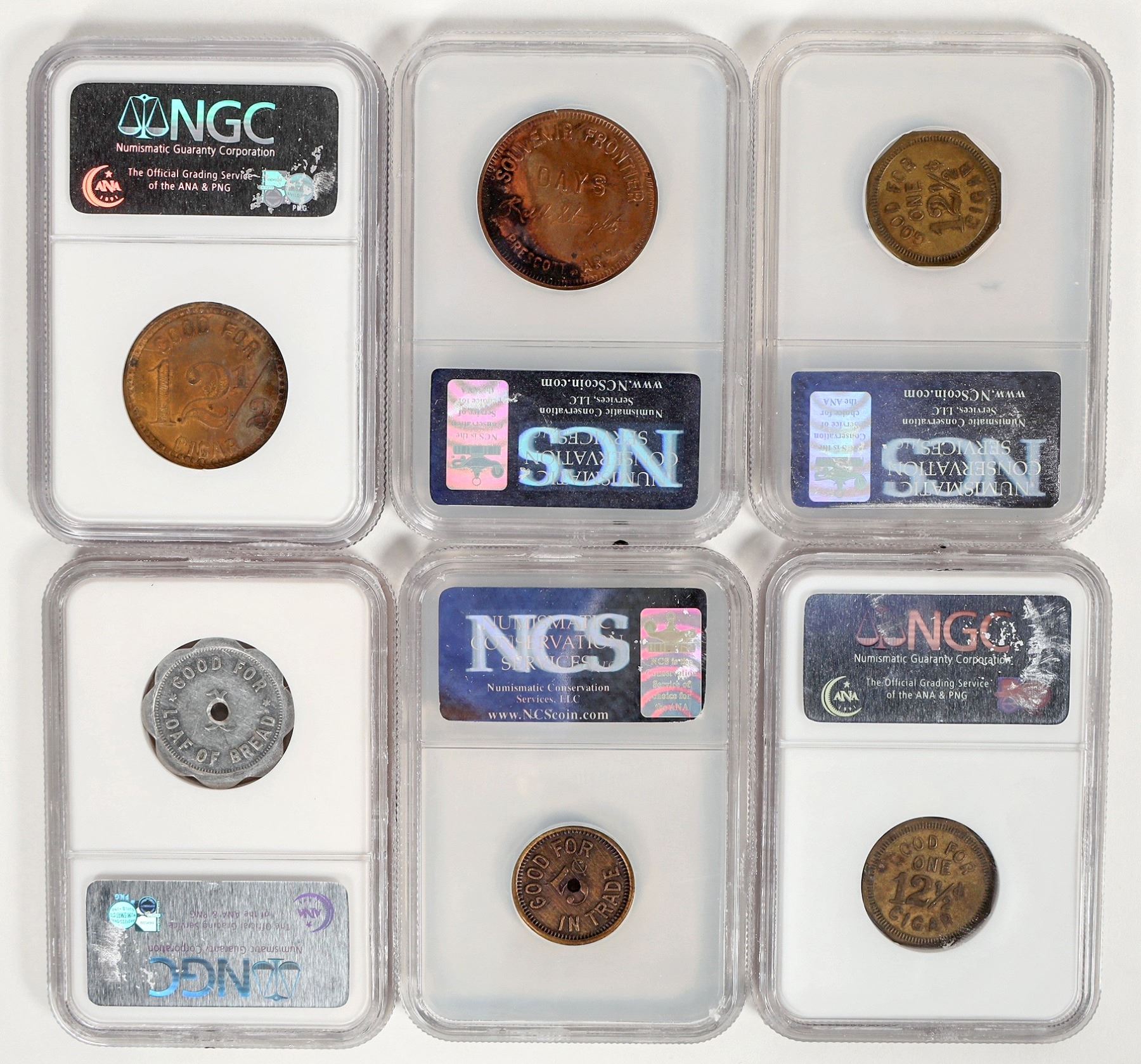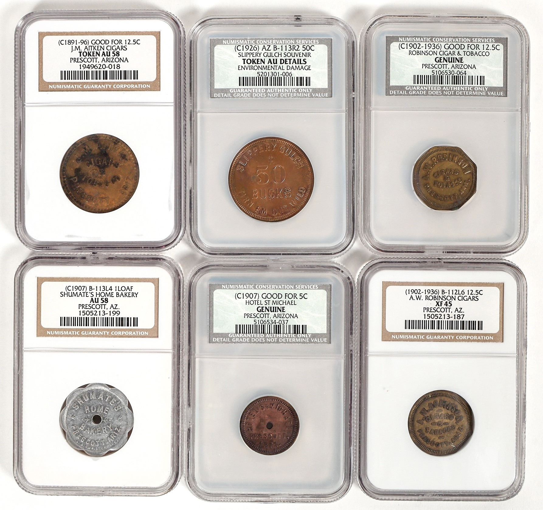 Six certified tokens from Yavapai County: 1) Slippery Gulch Souvenir, GF 50c; AU details, environmental damage (NCS). 2) J. M. Aitken Cigars, GF 12 1/2 c; AU 58 (NGC). 3) A. W. Robinson Cigars, GF 12 1/2c; XF 45 (NGC). 4) Hotel St. Michael, GF 5c; Genuine (NCS). 5) Shumate's Home Bakery; GF one loaf; AU 58 (NGC). 6) Robinson Cigar & Tobacco, GF 12 1/2c; Genuine (NCS).