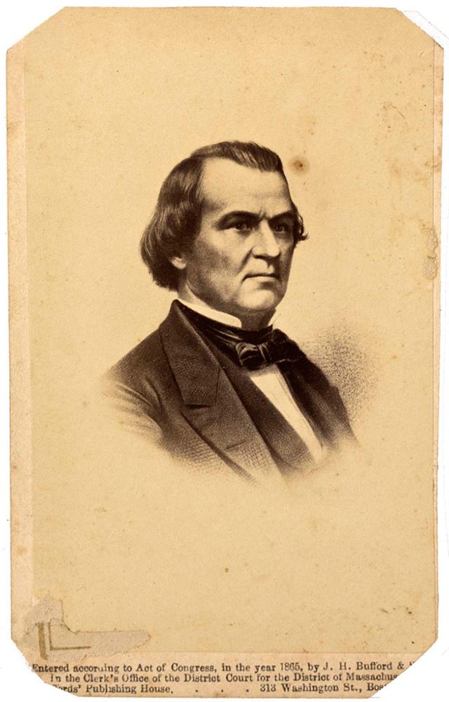 The predecessors of cartes de visite were calling cards. During the 1850s, it was the custom to present one`s calling card at the time of a social visit. Families would often provide decorative baskets or trays to receive calling cards from visitors. During the 1850s, there were sporadic reports of photographers in the U.S. or Europe preparing photographic calling cards, in which the portrait replaces the engraved name. Johnson served as President after Abraham Lincoln`s assassination from 1865-1869. In 1868, he came within one vote of being removed from office during impeachment hearings. The card has small stains, name of the subject handwritten on the back and is in very good condition.