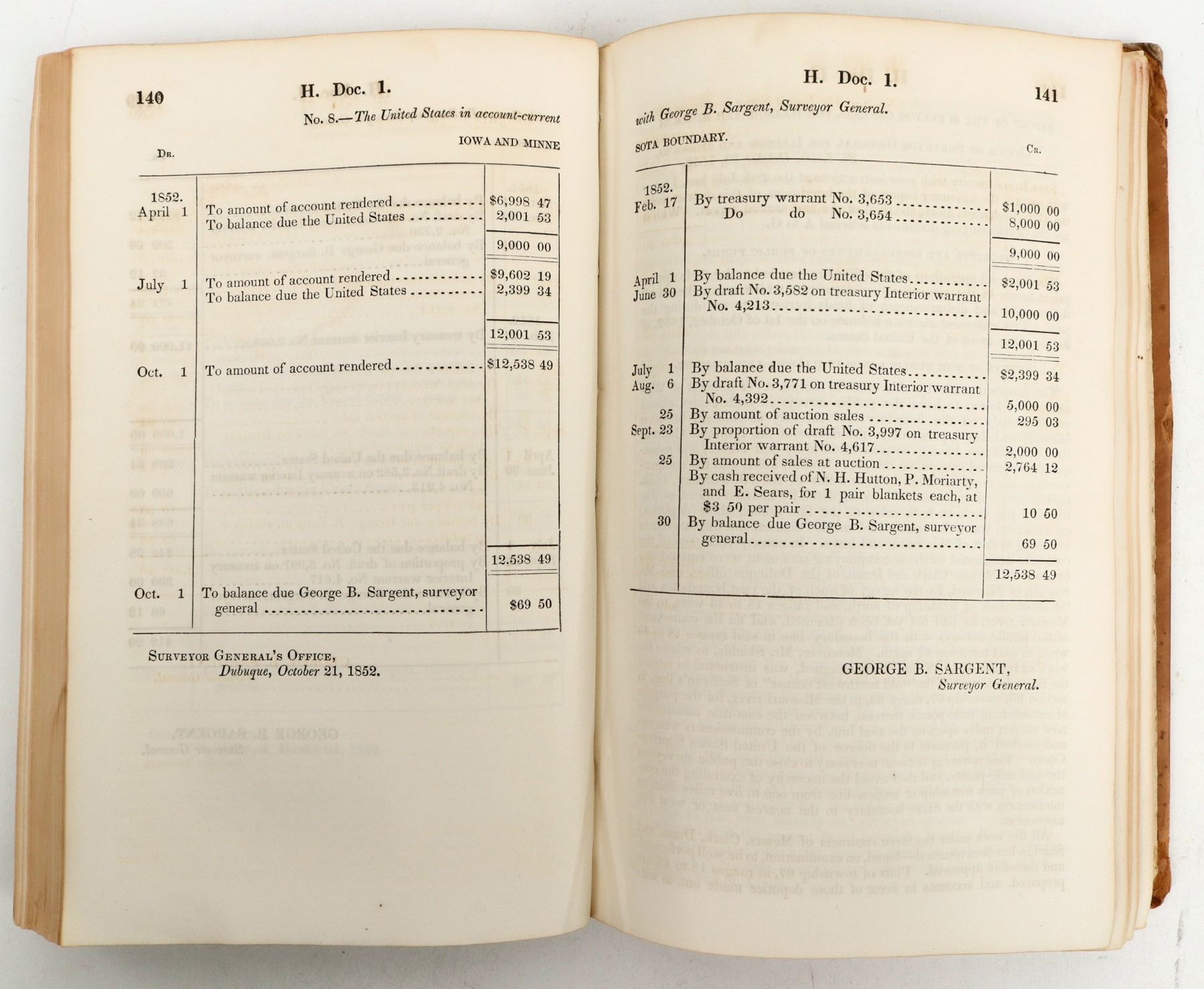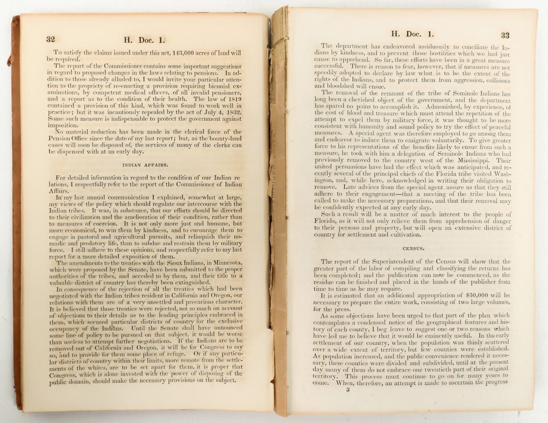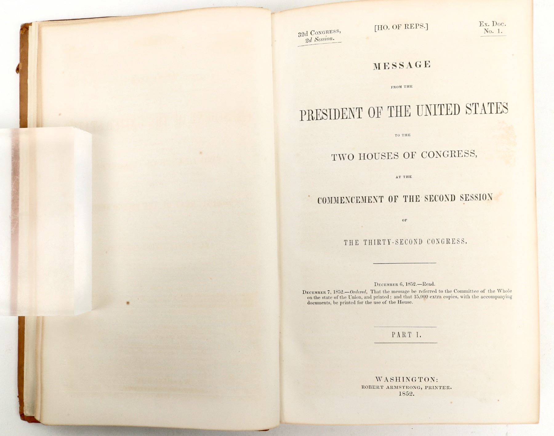 President Fillmore addresses both houses of Congress in Second Session, Thirty Second Congress., Dec7, 1852. 216 pgs. Includes General Land Office report of 1852. maps removed. The text clearly states that the Govt does not want land surveyed unless necessary. They also had severe problems employing qualified people to conduct surveys, a problem that persisted through the 1850s. The maps have been removed and placed into specific sate suites to allow for specific state survey study through time, since these reports are, in essence, about the "westward movement." I.E.; . Outside cover has separated from binding. Inside pages are in good condition . No discussion of the California Gold Rush.