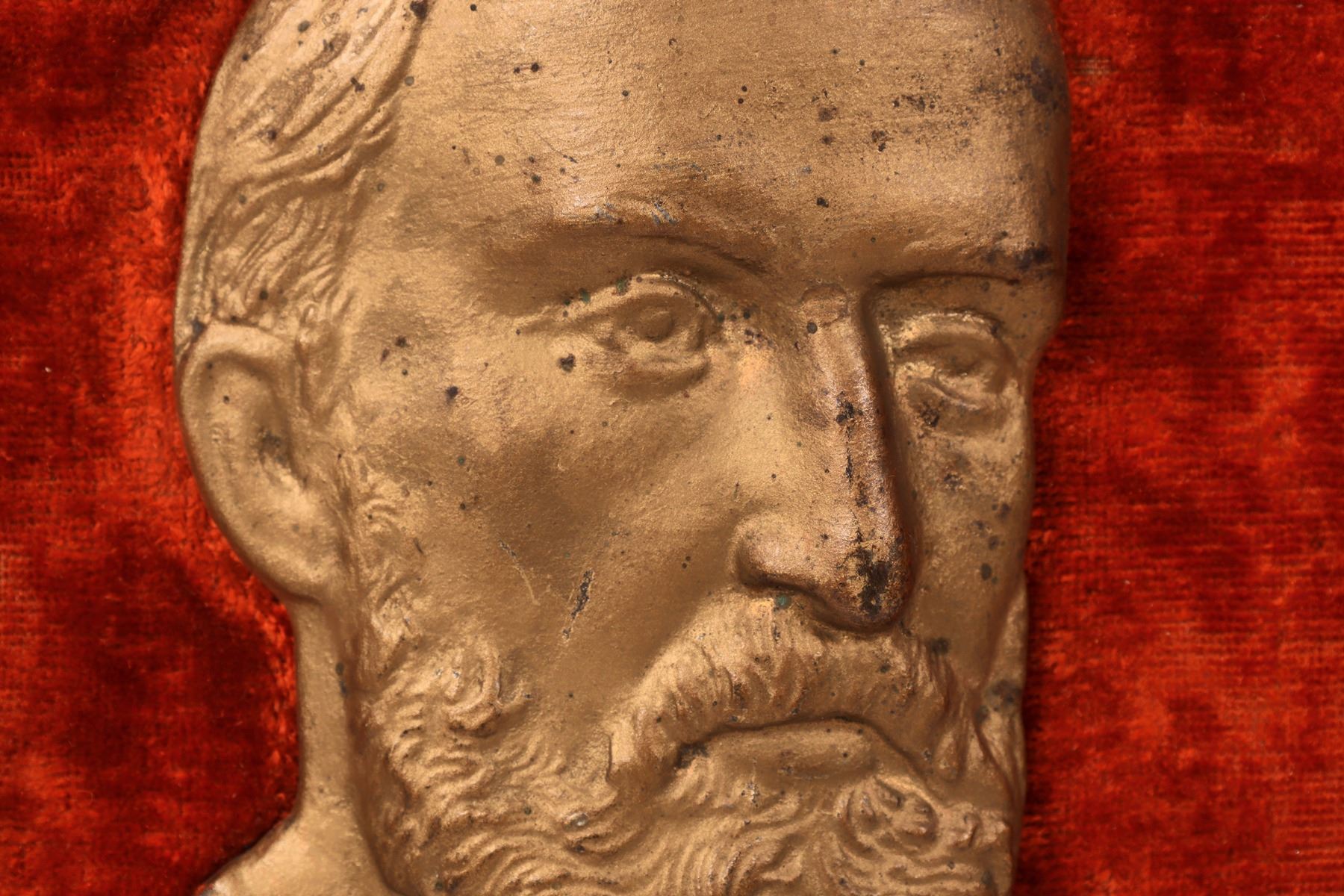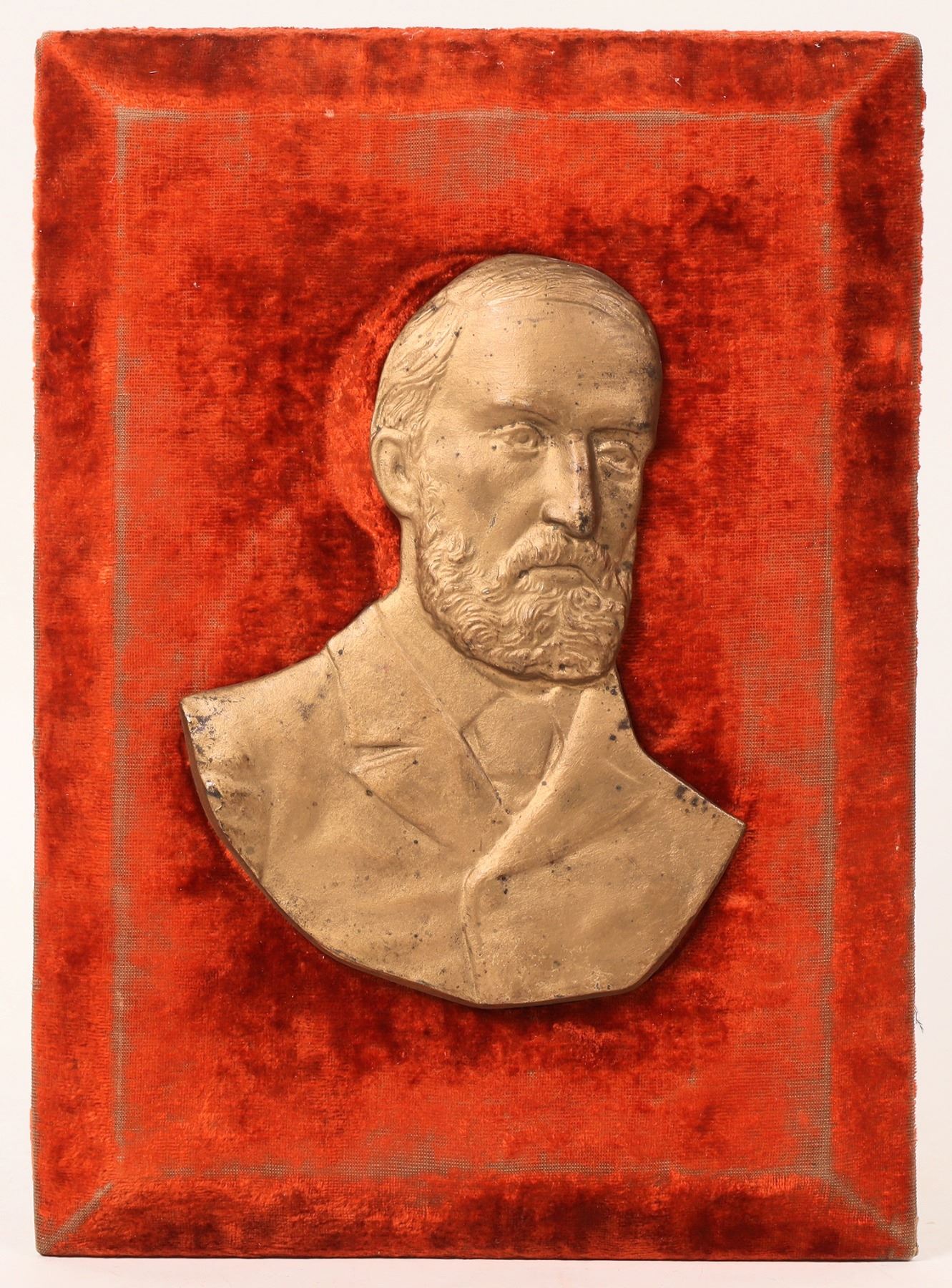 President James Garfield plaque, measuring 10"x 15" with painted metal figure measuring about 6"x 9". Looks to be from the period, during which time, several memorial items were made in honor of the slain president. Please see photos for more details. 1880s