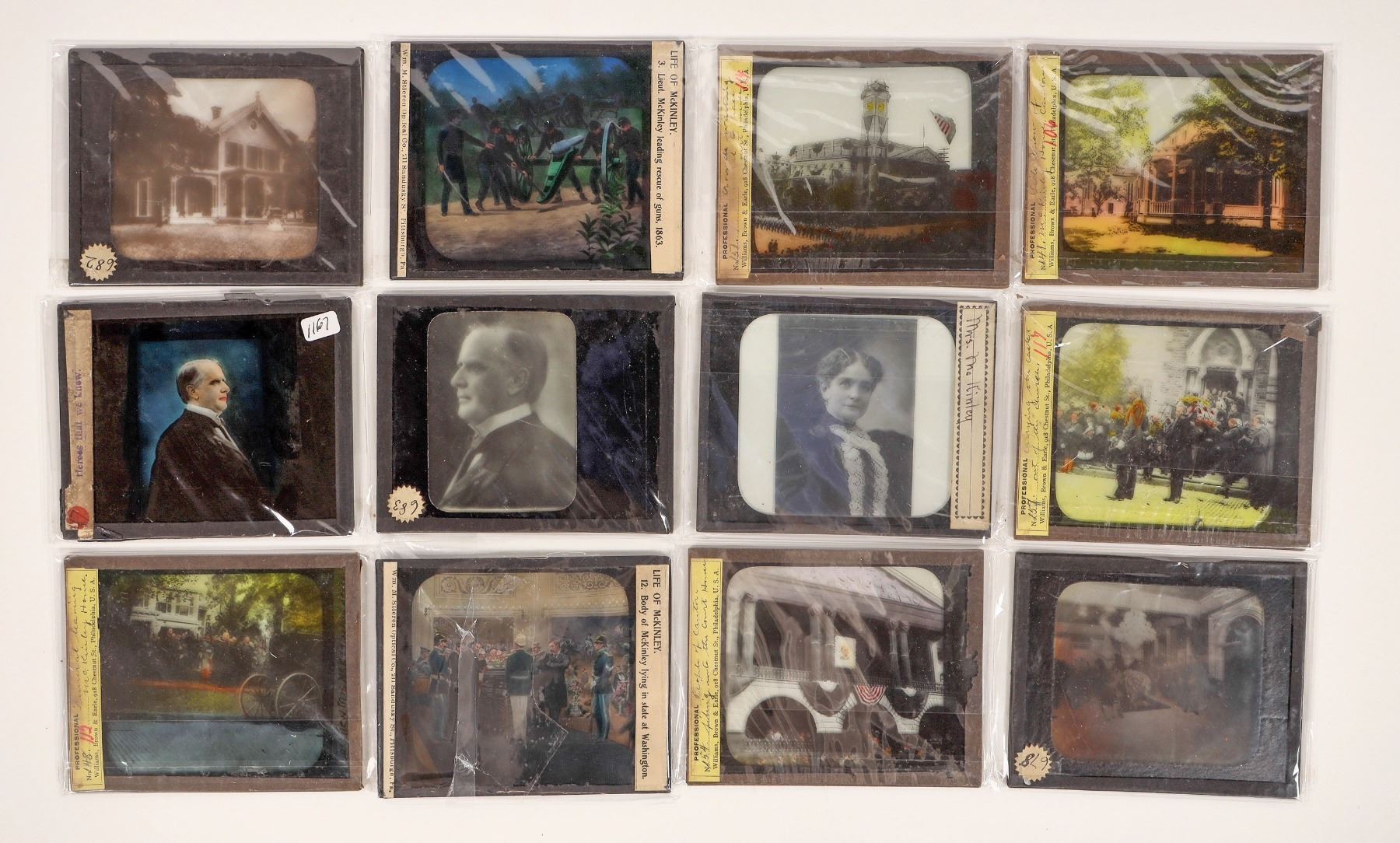 This set of glass slides are in the 3.25 in. X 4 in. format. There are twelve slides in all; most are by Williams, Brown & Earle while others are colorizations of the funeral by Wm. M. Stieren Optical Co. Condition is spectacular. A very rare set. The 25th President, William McKinley, was greeting people at the Pan-American Expo. in Buffalo when an assassin produced a gun while the president offered his handshake. The president would succumb to gangrene infection seven days following the shooting. The Temple of Music was removed twice from the president's schedule but he went anyway. Congress later passed a resolution that the Secret Service would furthermore protect the presidents. c. 1901.