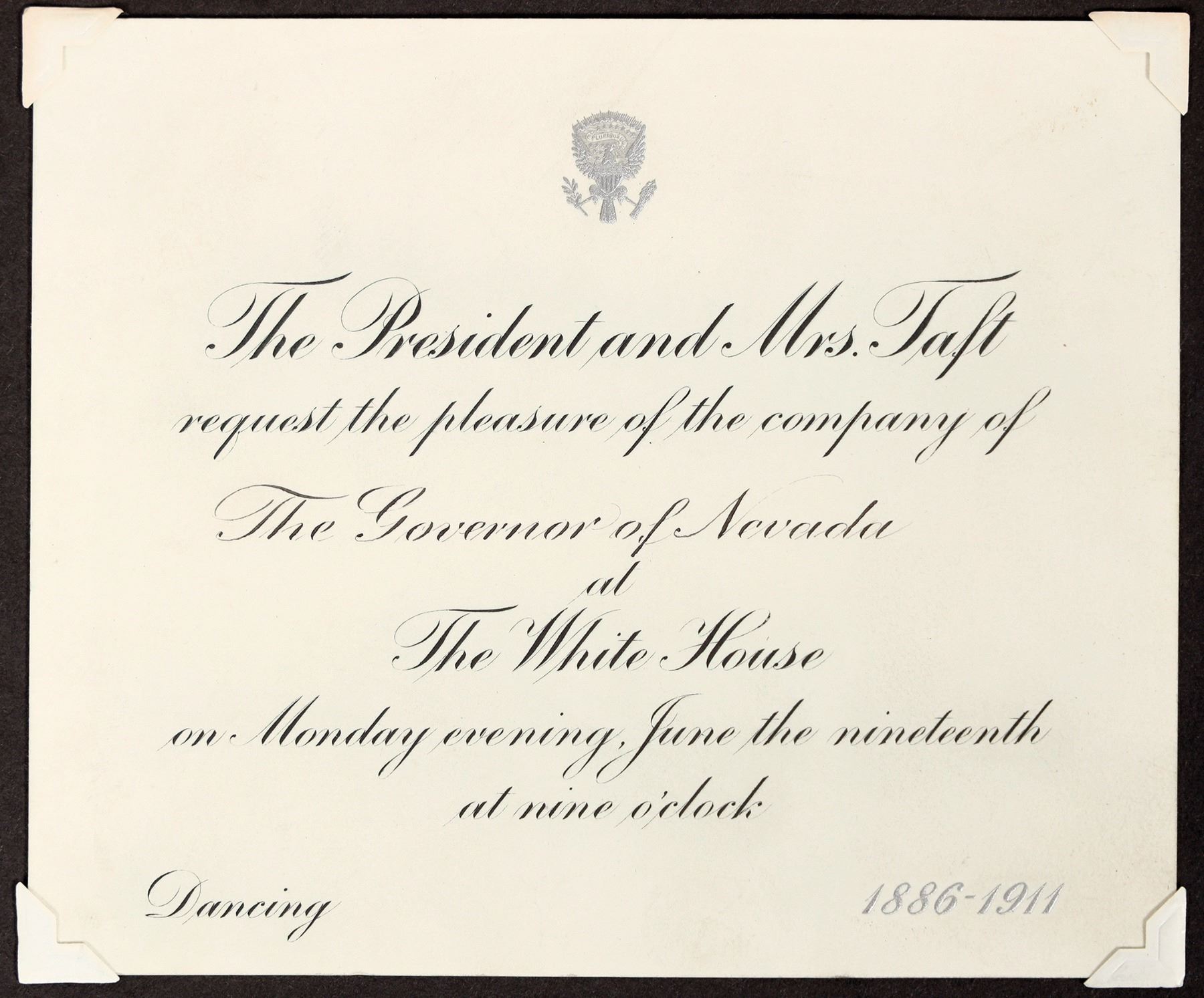 White House invitation from President and Mrs. Taft on cardstock for Governor Tasker L. Oddie to visit the White House on Monday, June 19th, 1911. In the bottom left corner is "Dancing" and in the bottom right corner is "1886-1911" in silver. We are unsure what these dates refer to. 4.75 x 5.5" It does not appear Oddie accepted the invitation, though he did telegraph the President on June 9th to invite him to visit Nevada on a proposed tour of the West. Taft would be defeated by Woodrow Wilson in the 1912 election. Tasker Oddie was the 12th governor of NV from 1911-15 and a US Senator for Nevada from 1921-33.