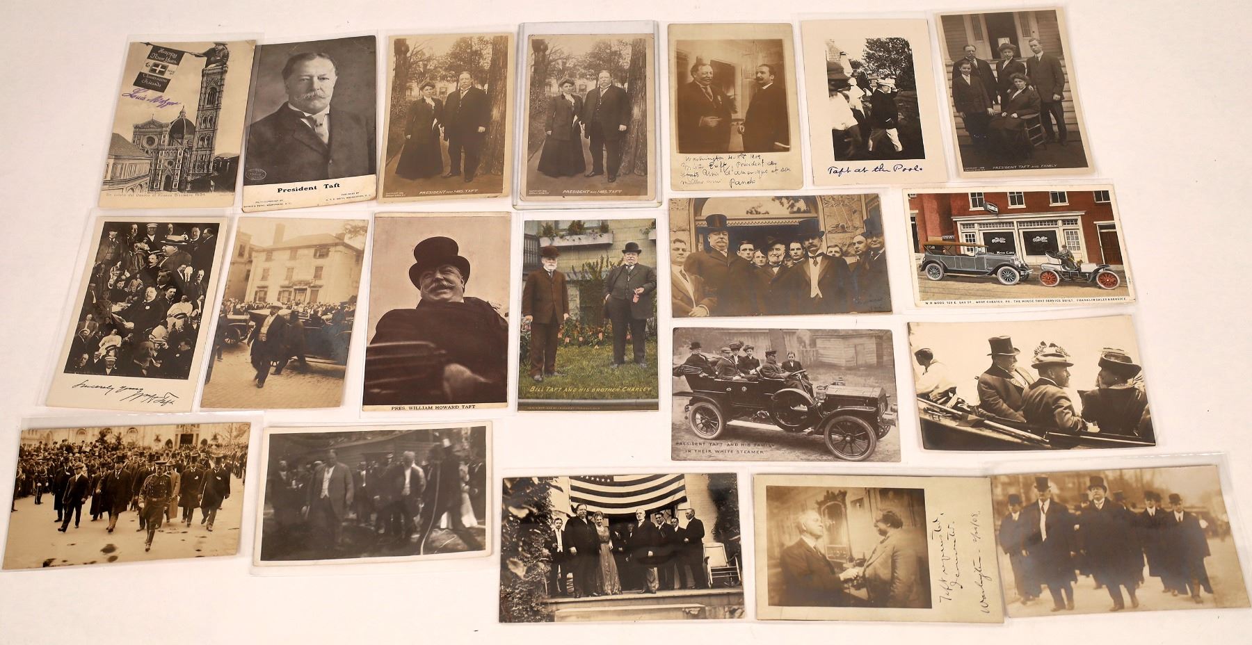 Twenty-one RPCs featuring the 27th president, William Howard Taft, in public, from the U.S. and France, c1904-1910. Includes six canceled from California, Montana, Washington, D.C., and France, with stamps, the rest blank. Some of the blank ones have original written descriptions of the photos. Date: 1904-1910 Country (if not USA): State: City: Provenance: Ken Prag Collection