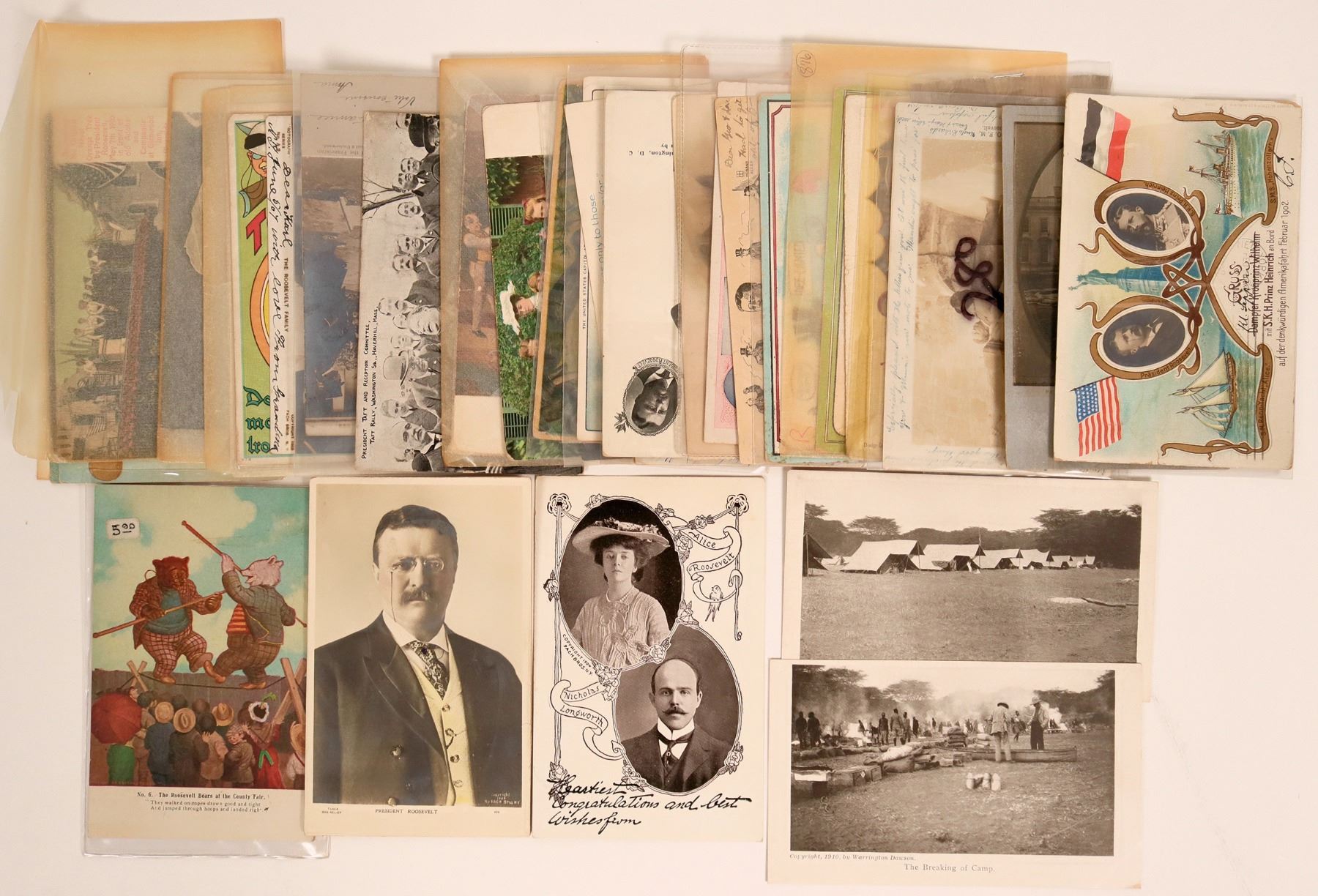 Lot of 35 early postcards feat. Teddy Roosevelt or family, incl. a rare RPPC, a holographic card, and a ribbon (National Ribbon Co., Paterson, NJ). RPPC is of Roosevelt with Reverend Ludgerus Glauber at the Santa Barbara mission in 1908. Holographic card has views of the White House and Roosevelt, c. Pach Bros., NY, 1904. Other postcards are a mix of political cartoon cards (including the "Roosevelt Bears") and real-life views of Roosevelt in office. Also includes a Bas-Relief Photo-Card printed by Bamforth & Co. Most cards appear to be pre-1910. This is a fantastic group!