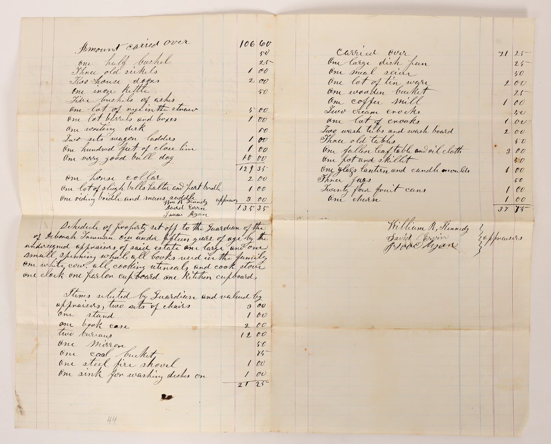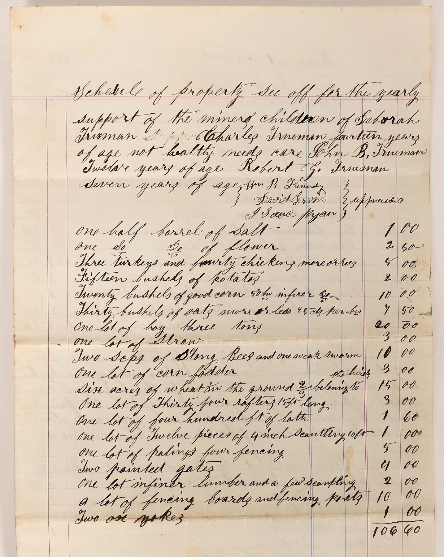 Undated, handwritten inventory set off for the support of the minor children of Deborah Truman: Charles Truman, fourteen years of age, not healthy, needs care; John B. Truman, twelve years of age; Robert G. Truman, seven years of age. Signed by three appraisers. [