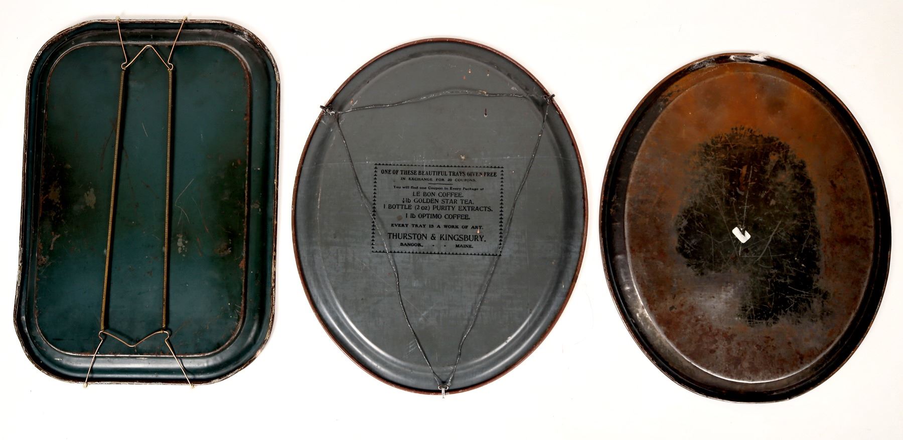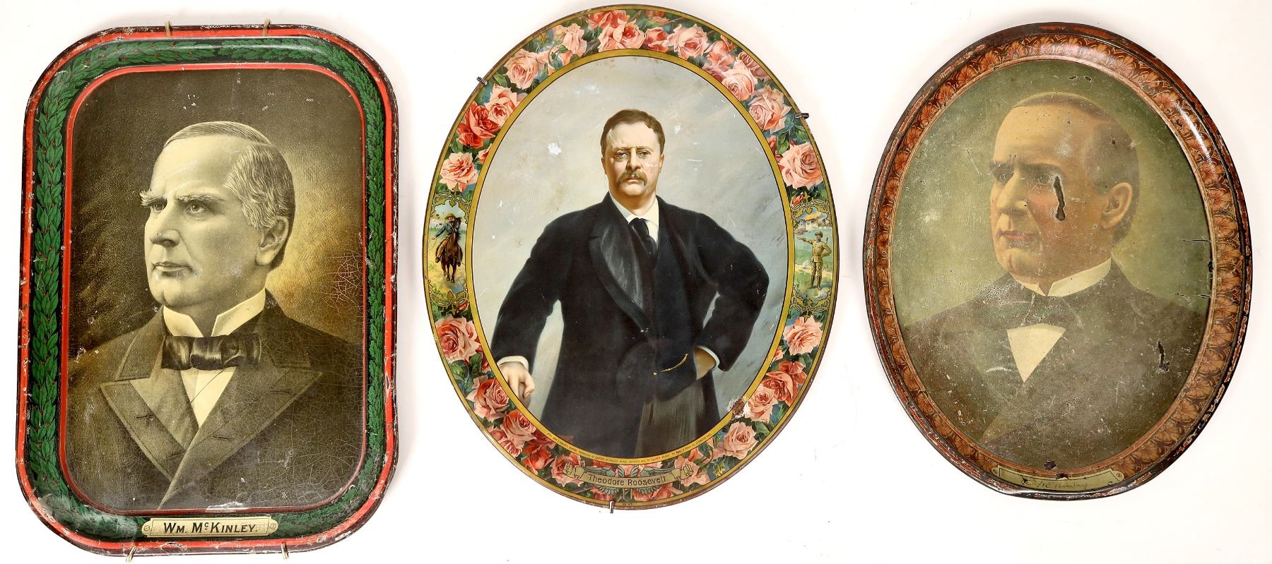 RARE!! Three pre-prohibition highly collectable presidential beer trays w/ 2 of the trays featuring McKinley and 1 tray featuring T. Roosevelt. 1) McKinley rectangular Christmas tray 12 x 17". 2) McKinley oval signature tray, 13 x 16" w/ print of McKinley's signature at bottom. 3) T. Roosevelt no. 47. oval tray 17 x 14", "After John S. sargent painting reproduced by courtesy of Collier's Weekly, copyright in 1903, made by Meek and Beach Co., Coshocton, Ohio". Printed on reverse is coupon information on how to redeem for a free tray by Thurston and Kingsbury in Bangor, Maine. Republican William McKinley was inaugurated in 1897 and assassinated in 1901 at 58 years of age. Theodore Roosevelt was inaugurated in 1901 c. 1890-1901