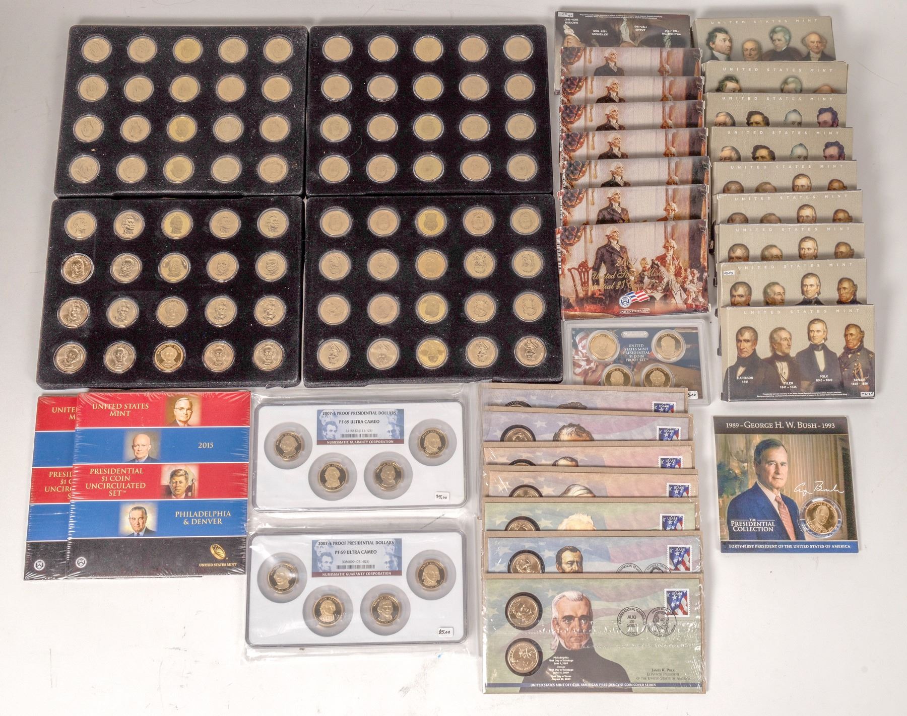 From 2007 to 2011, Presidential dollar coins were minted for circulation in large numbers, resulting in a large stockpile of unused $1 coins. From 2012 to 2016, new coins in the series were minted only for collectors. A new coin was released on December 4, 2020, to honor George H. W. Bush, who died after the original program ended. This lot has 80 BU dollars in hard plastic, on black velvet trays. 14 coins on first day covers. 8 proof 2007-S dollars certified PF 69 in NGC holders. One George H. W. Bush. 16 dollars issued in 2015 in original mint packaging. 18 U. S. Mint Presidential Proof sets (four coins each): 2007 (8); 2008 (3); 2009 (5); 2010 (2). Almost 200 BU one dollar coins.