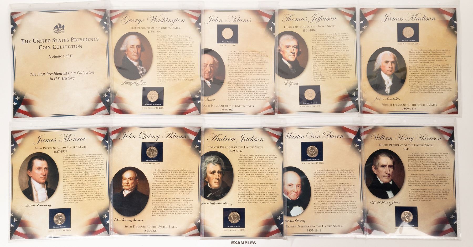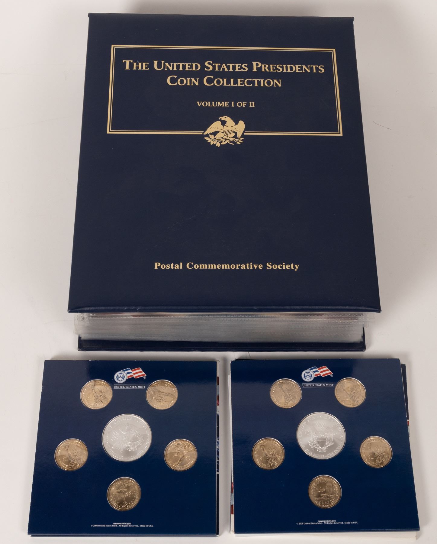 Big blue binder from Postal Commemorative Society with the presidential coins and biographies of the first 25 presidents, empty sleeves to add the rest. Also two 2008 United States Mint Annual Uncirculated Dollar Coin Set: each contains four Presidential coins, a Sacawagaea dollar, and 2008 silver eagle.