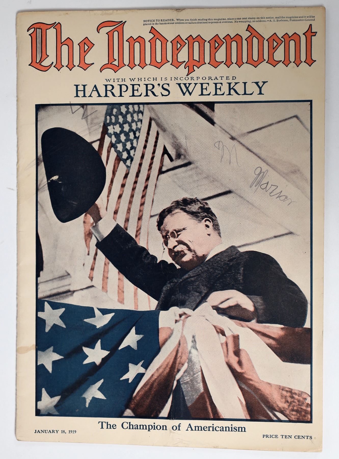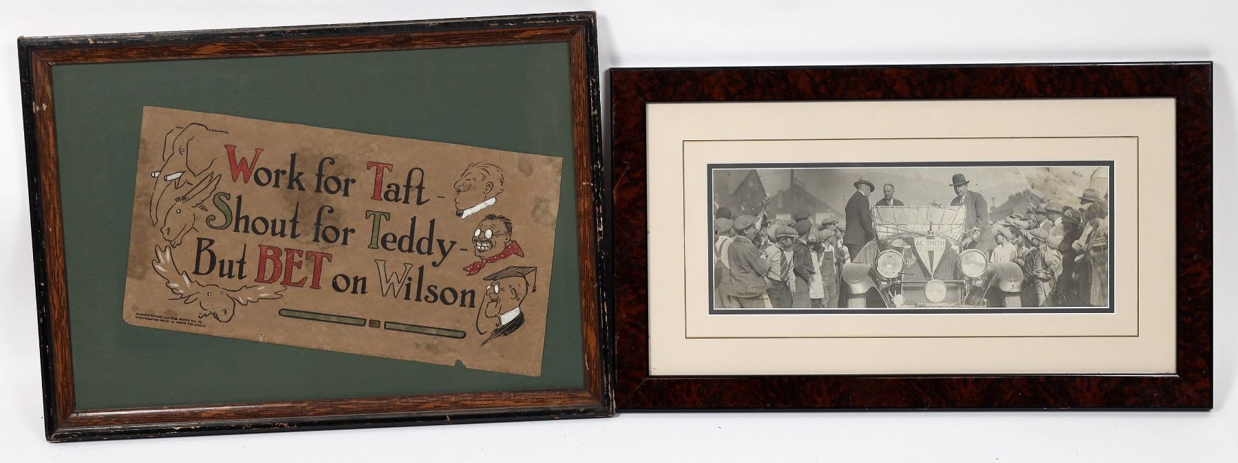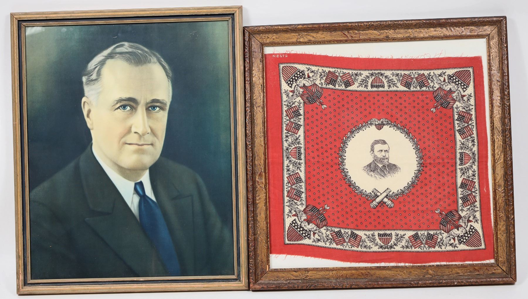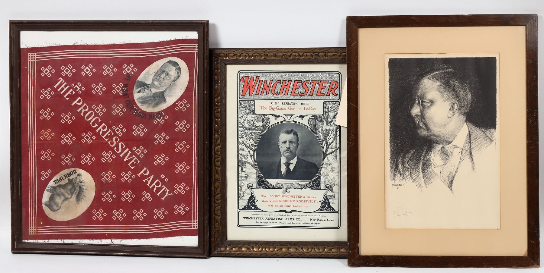 Framed presidential group plus an also ran. Theodore Roosevelt charcoal print by Mielzner, #14/16?, 15.5x10". Winchester 1901 30-30 advertisement 16x11", We Want Our Teddy Back handkerchief 17x17". Non framed The Independent, January, 1919 with some pencil writing on cover-vertical fold. Work for Taft, hand colored, 7.5x14"stained and edge chip. US Grant handkerchief 14x15". FDR print 18x14". Al Smith panorama 4.5x12.5", right edges creases and 1" tear.