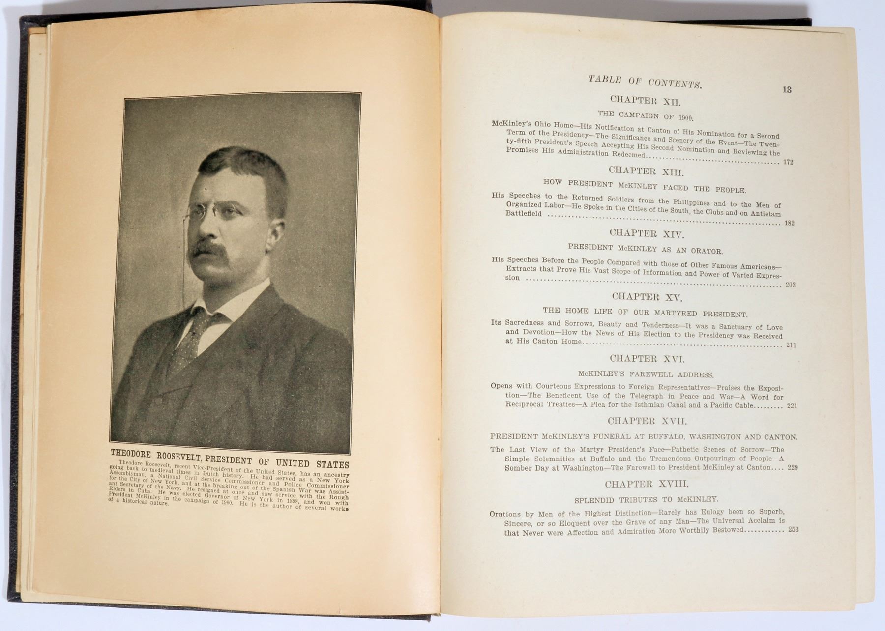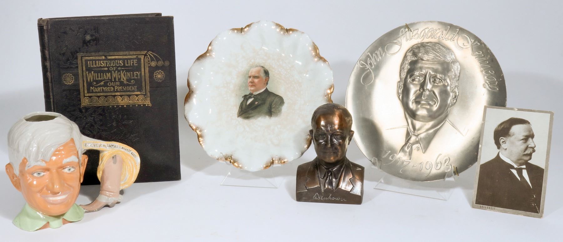 President and other group. Includes a memorial plate of William McKinley, as well as a hardcover copy of his biographer. Also included is a coin bank in the shape of a bust of Dwight Eisenhower, as well as a metal plate commemorating John F. Kennedy, a postcard from 1908 of William Howard Taft. Lastly is a Mug in the likeness of political humorist and actor Will Rogers. This lot is consigned by either Mary Elenore or Swick. Please see photos for more details. 1908