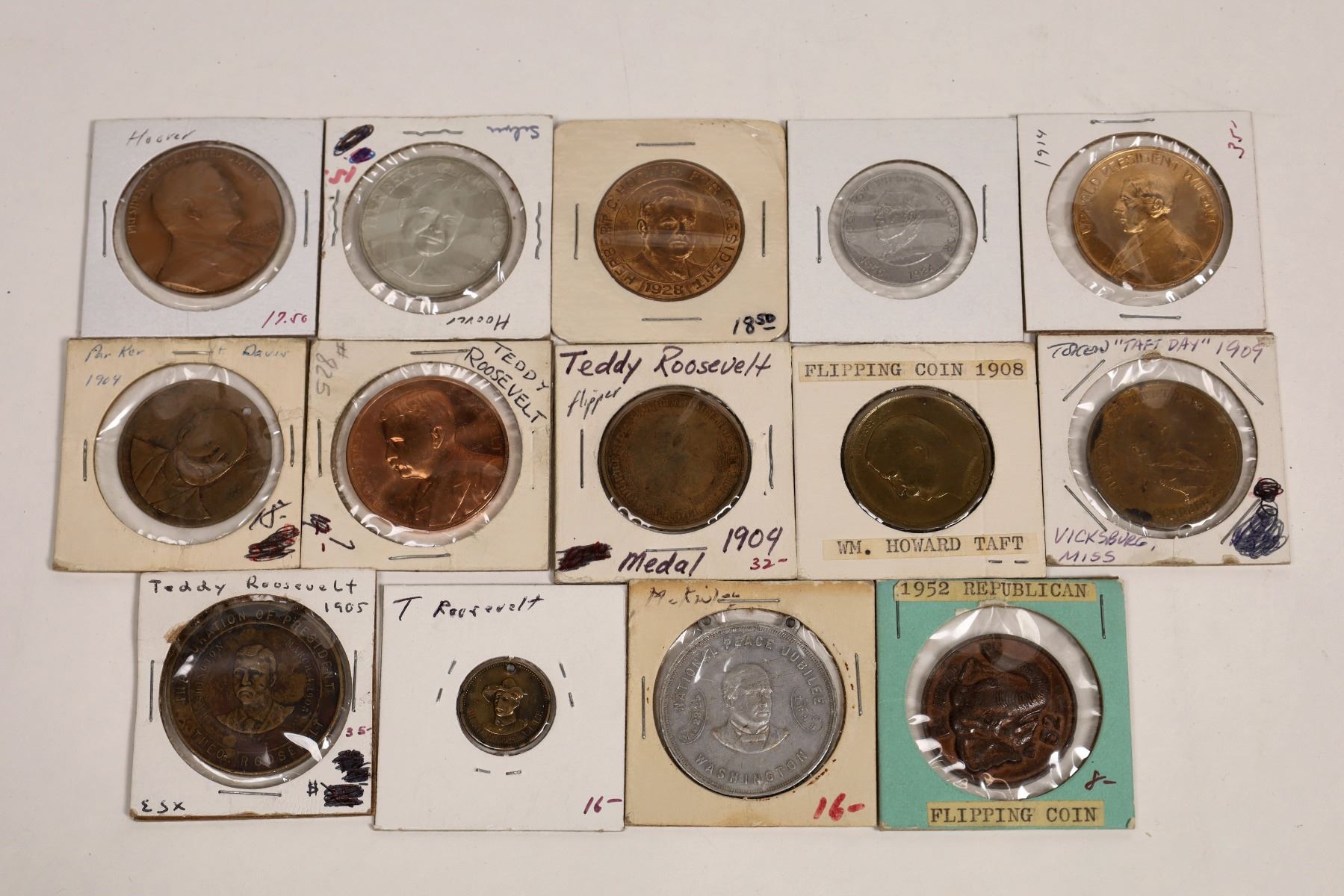 Lot of 14 medals featuring presidents: 1899 National Peace Jubilee: McKinley; four Teddy Roosevelt circa 1904-05; Alton Parker 1904 (ran against Roosevelt); two Woodrow Wilson; three Herbert Hoover; two William Howard Taft; 1952 Republican flipping coin.