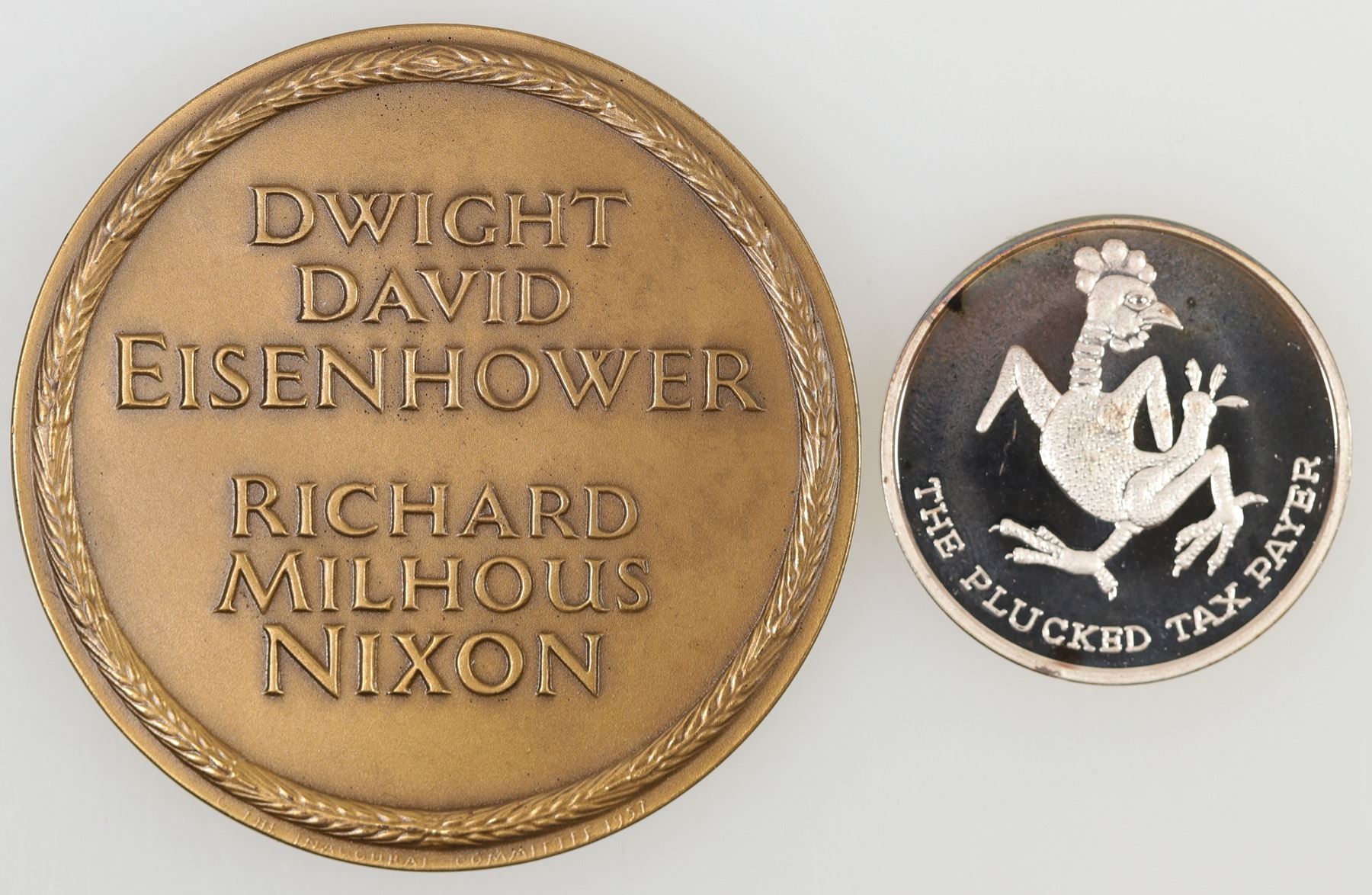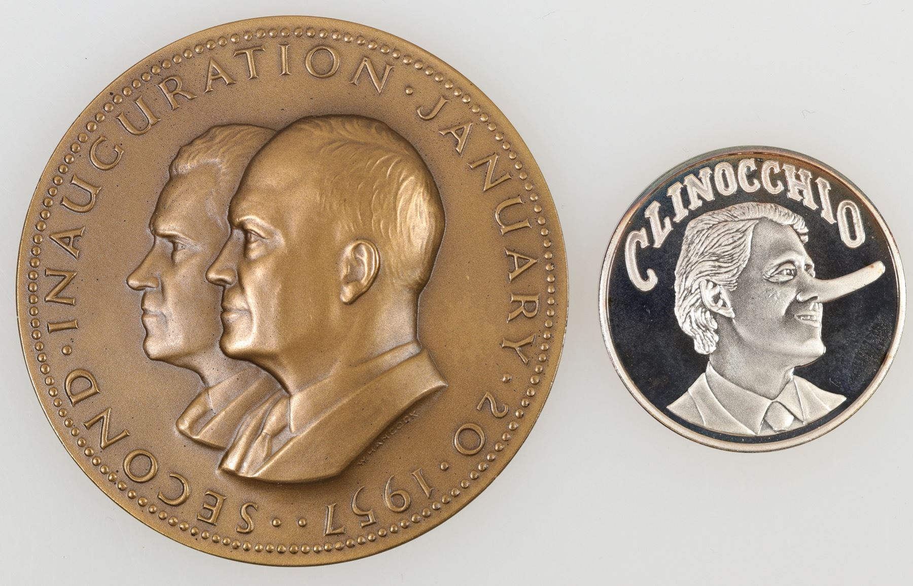 Lot of two: 1) Second Inauguration January 20, 1957 of Dwight David Eisenhower and Richard Milhous Nixon; in original box with paperwork from the Inaugural Committee, Washington, D.C. Bronze, 2 3/4 inches in diameter. 2) "The Plucked Tax Payer" / Clinocchio (Bill Clinton with an exaggerated proboscis). City: State: Date: Salvatore Falcone Collection