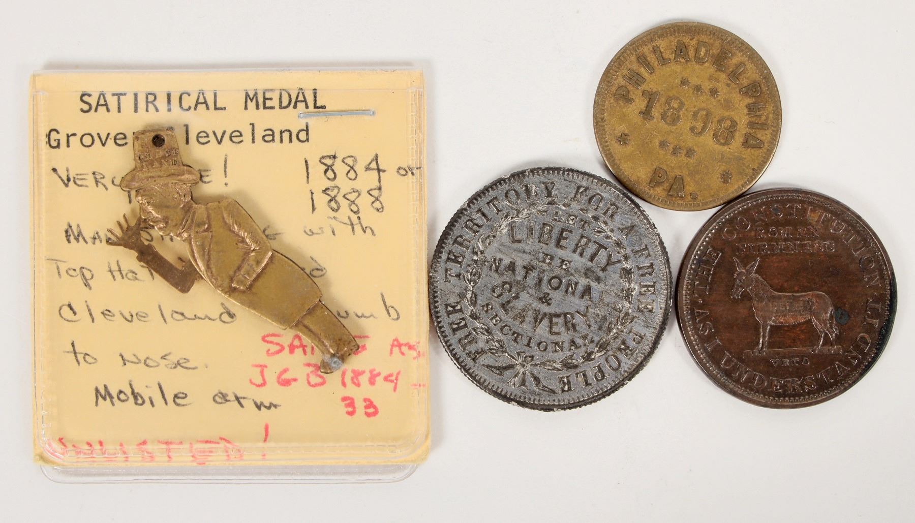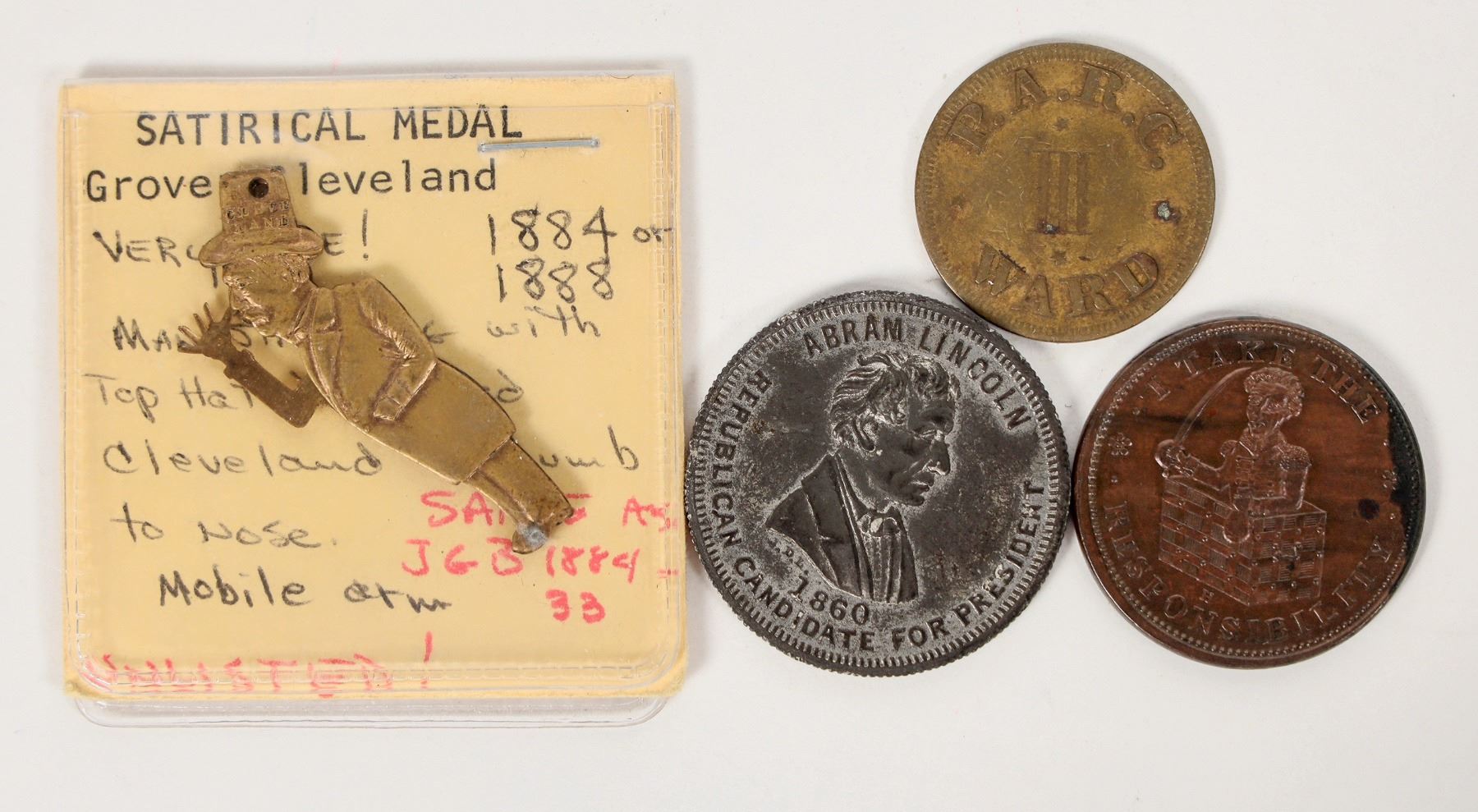 Four pieces: 1) 1833 Hard Times Cent Satire of Andy Jackson; Low 51. 2) 1898 Polish American Republican Committee, Philadelphia Ward 3; Br., rd., 24 mm. 3) Abraham Lincoln Republican Candidate for President 1860 // Free Territory For A Free People / Let / Liberty / Be / National / & / Slavery / Sectional; Wm, rd., 31 mm. Zabriskie 64; Satterlee 274; King 34. 4) Grover Cleveland: man standing with thumb to his nose; 40 mm tall, holed, two sided.