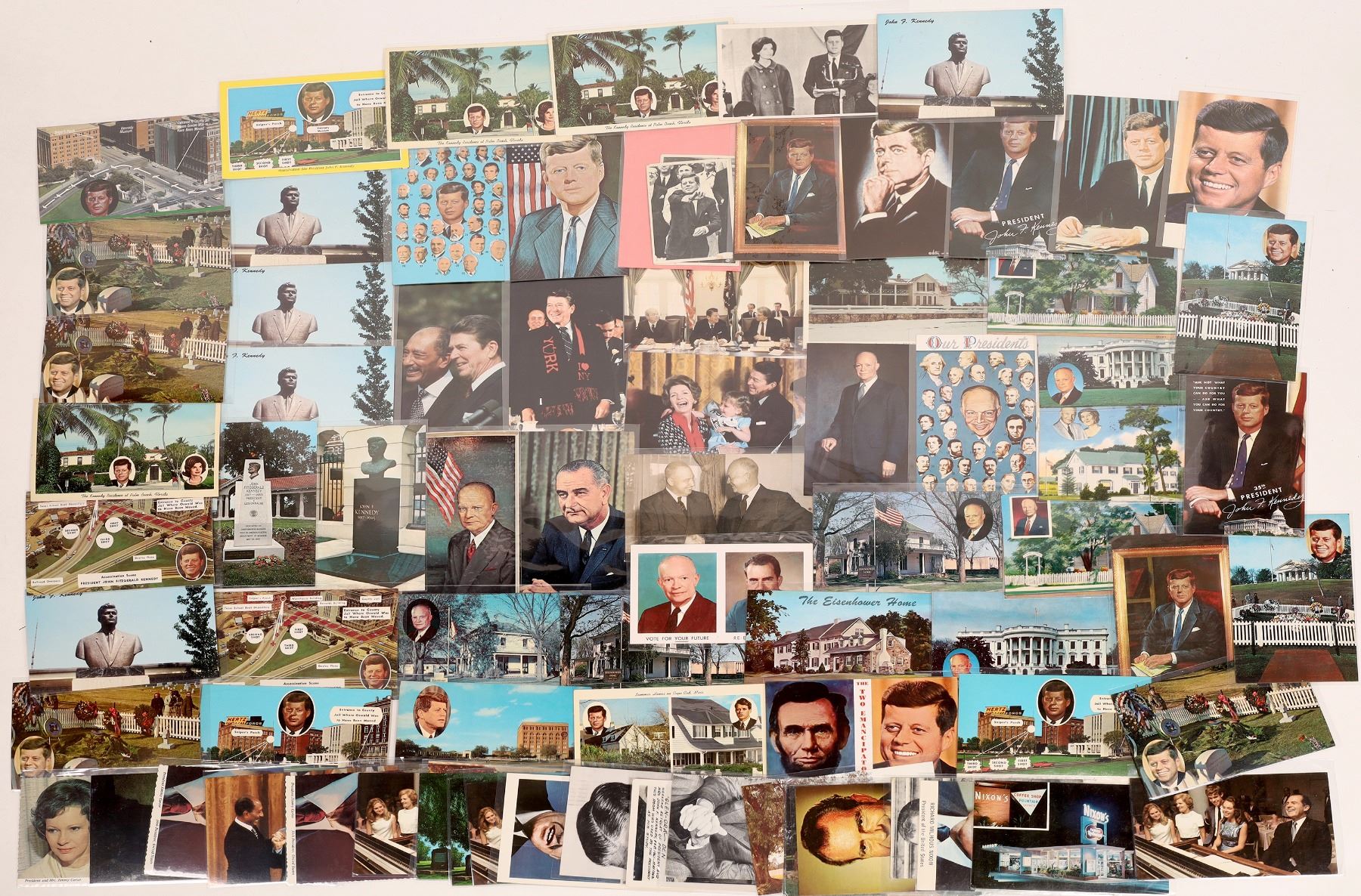 Lot of 7 Envelopes containing postcards. 1. Two Romney Postcards, one is signed and postmarked 1962. 2. Five color postcards of Pres. Carter in various poses. 3. Fourteen color and one B/W of Pres. Nixon, home and family . None postmarked 4. Pres. Kennedy :Thirty-six, three postmarked 1964-65. Portraits, grave, home, parade route. 5. Pres. Eisenhower, fourteen cards, three postmarked 1953-63: hone, White House and portraits. 6. Pres. Johnson, two: ranch and portrait. 7. Pres. Reagan. Four: family, cabinet meeting, with Sadat. In protective sleeves and excellent condition.