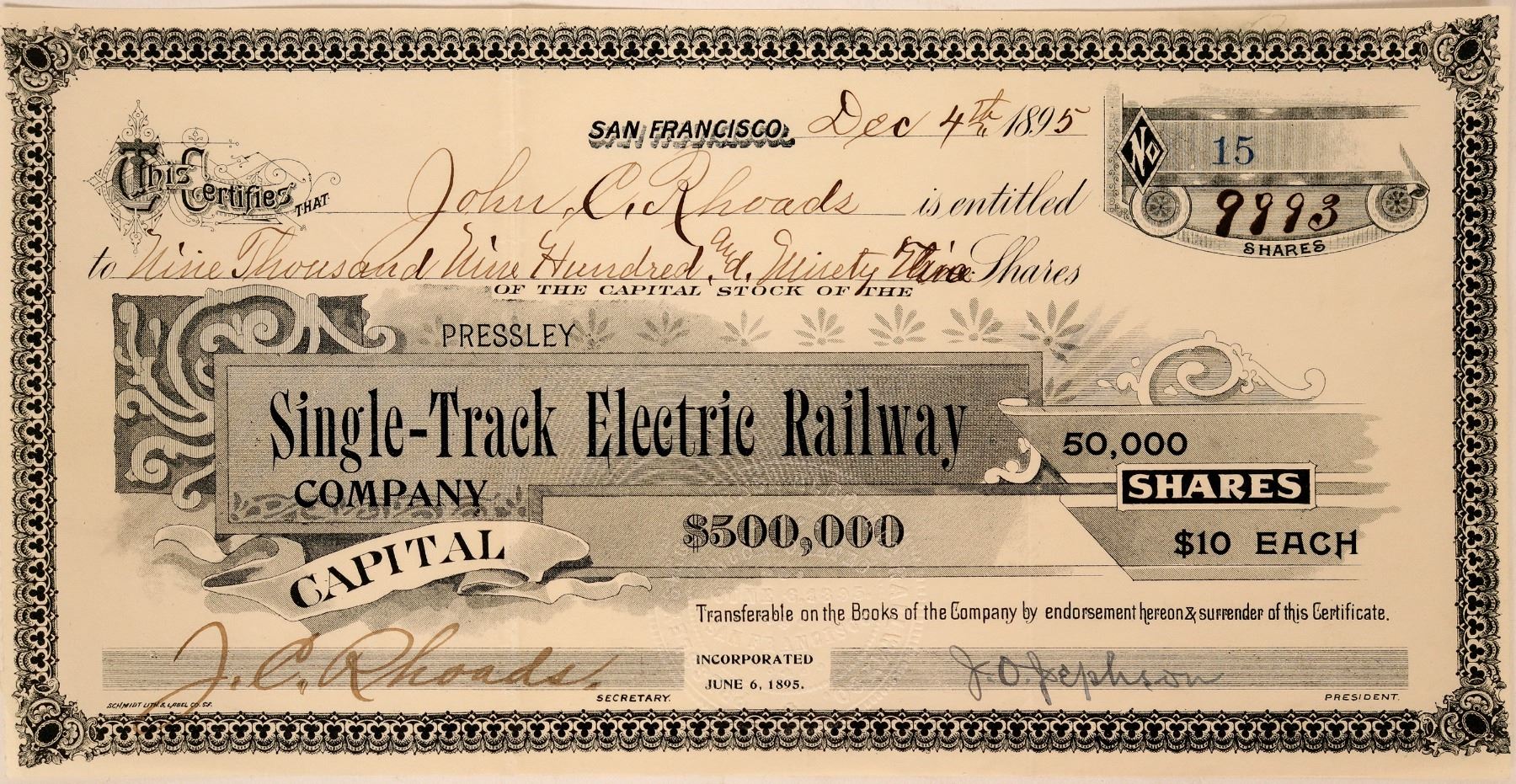 Extremely rare certificate we have not seen previously. The Pressley Single-Track Railway Company inc. in 1895 in California. Cert. #15, issued for 9,993 shares to John C. Rhoads, and signed by J.O. Jephson as president and J.C. Rhoads as secretary. The company was formed to purchase, use and sell patents for electromagnetic safety railways, etc (The Electrical World, 1895). The certificate was issued for nearly 20% of the total authorized shares. Printed by Schmidt Lithography, S.F. Two fold lines. VF. Uncancelled.