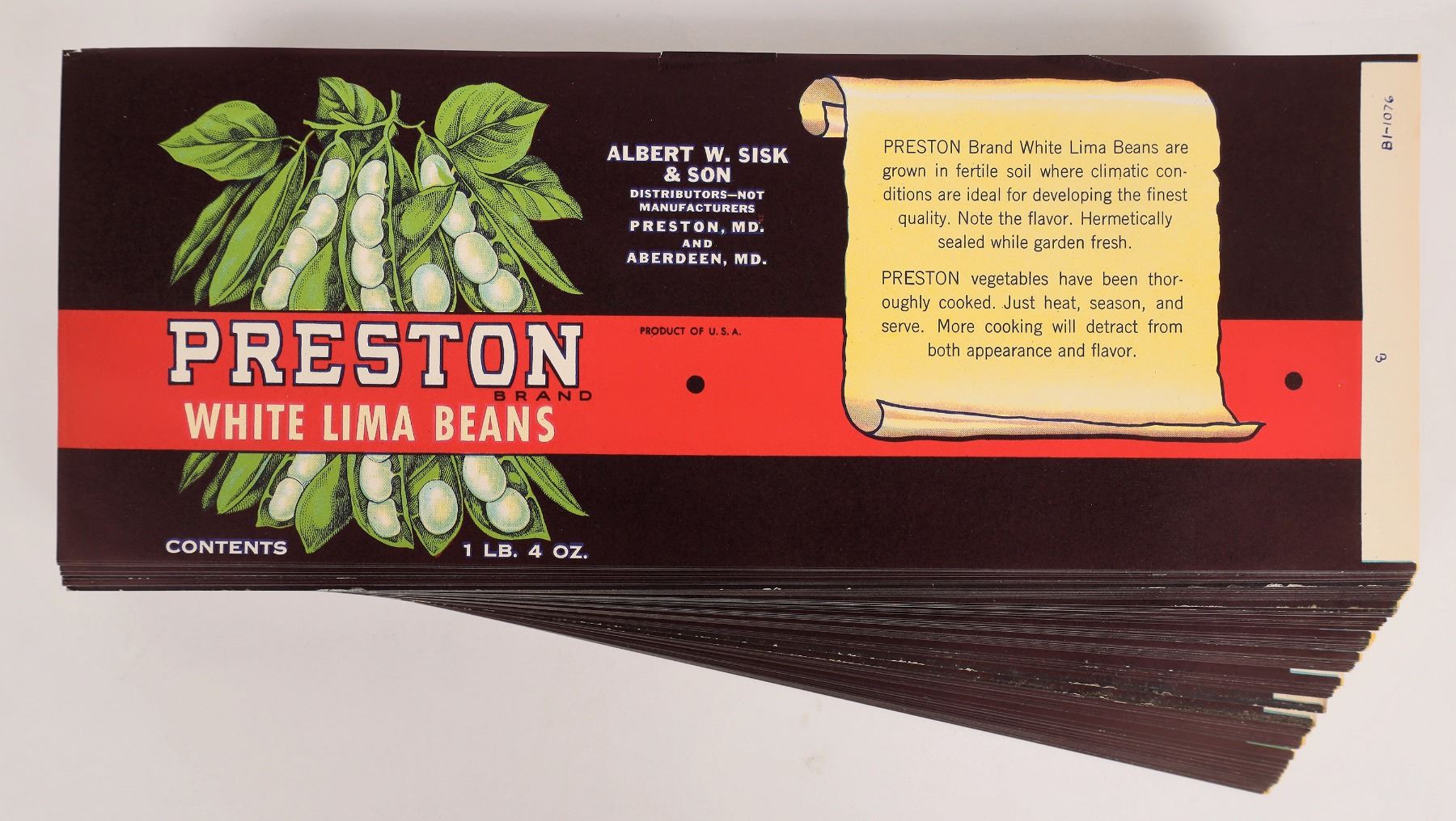 Paper label for 20oz cans of Preston White Lima Beans, Albert W. Sisk & Son, distributors not manufacturers. Dark purple background with wide red stripe and detailed illustration of white lima beans in open pods. 11.125 x 4.25 inches. ~500 pieces.