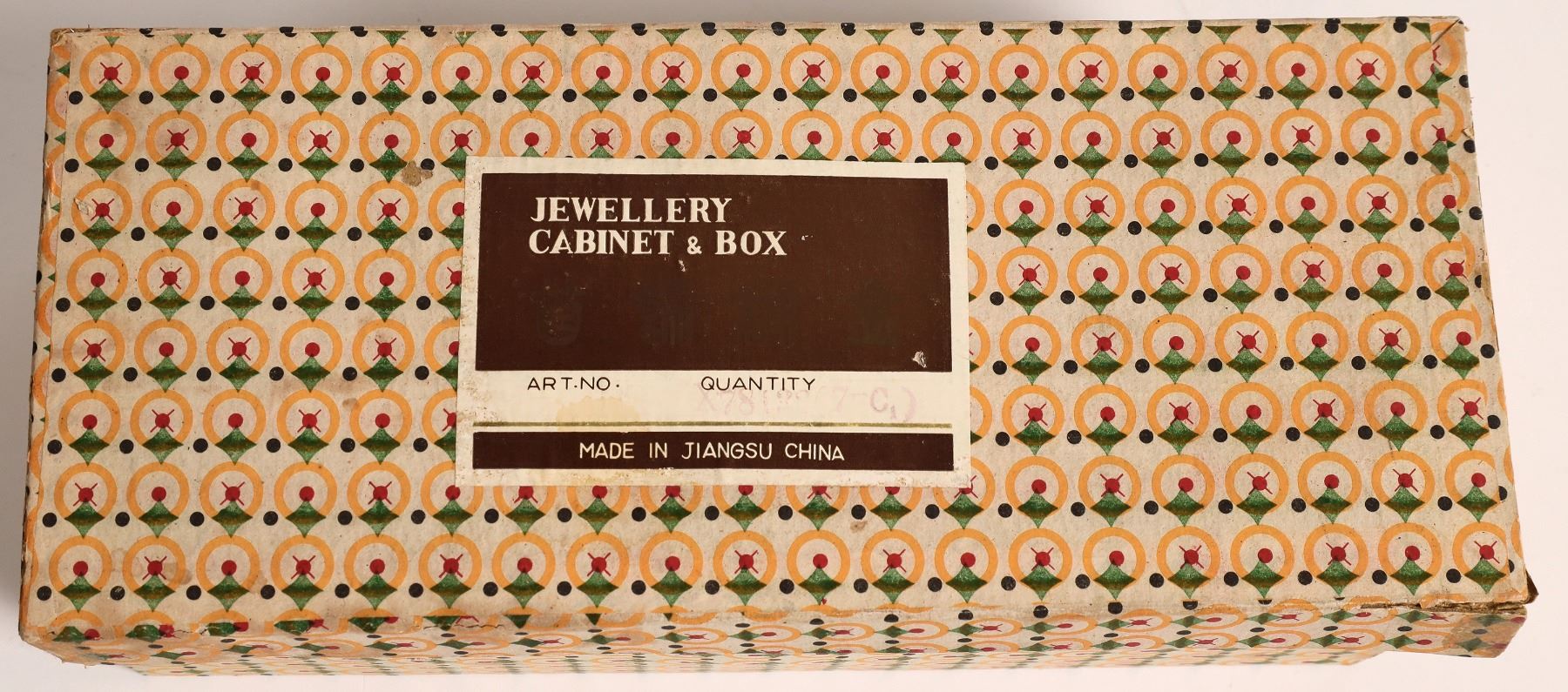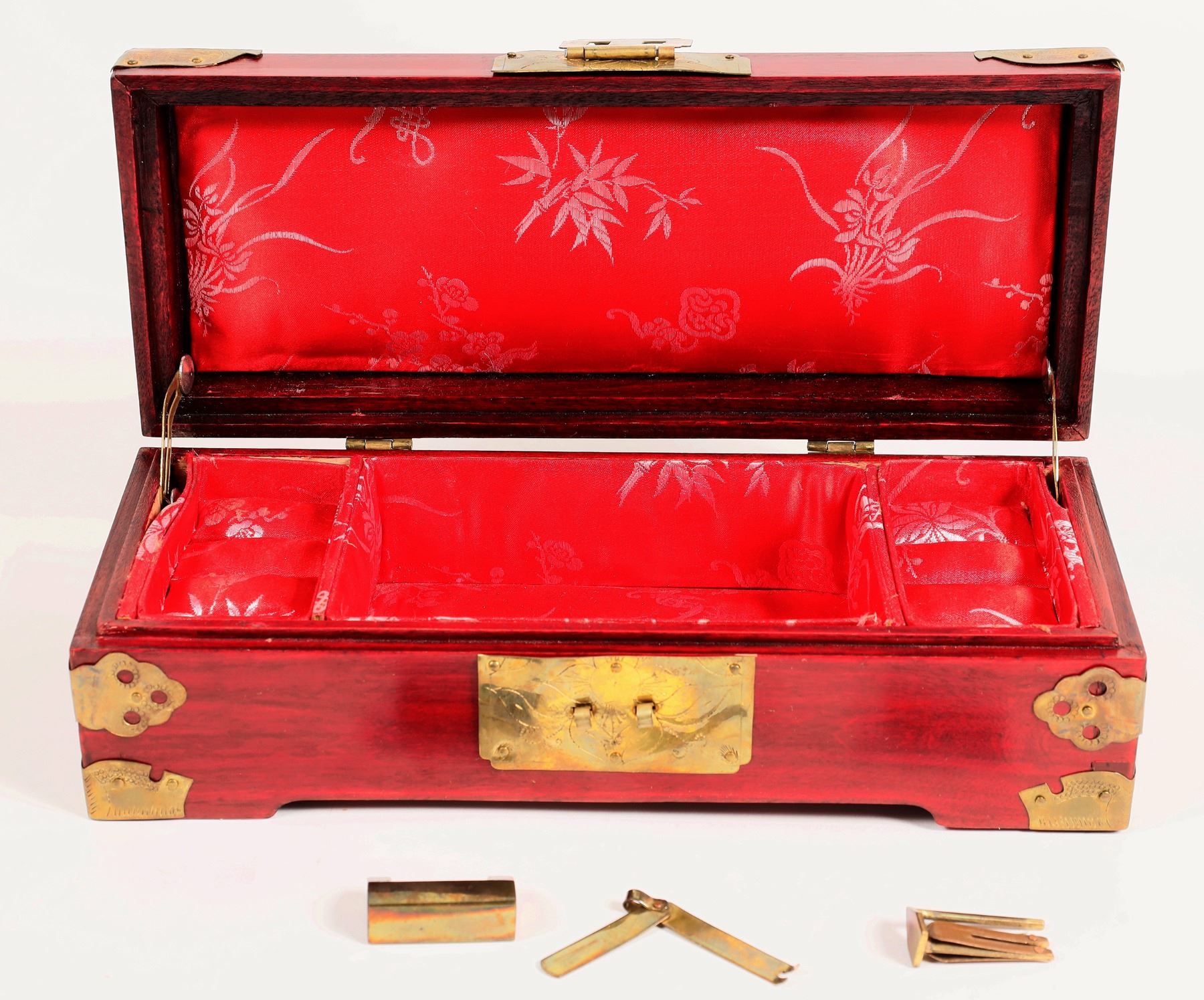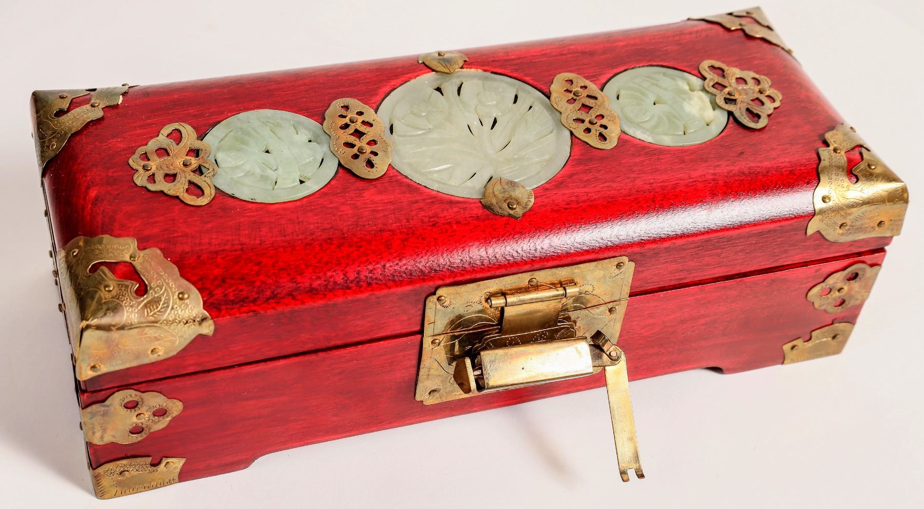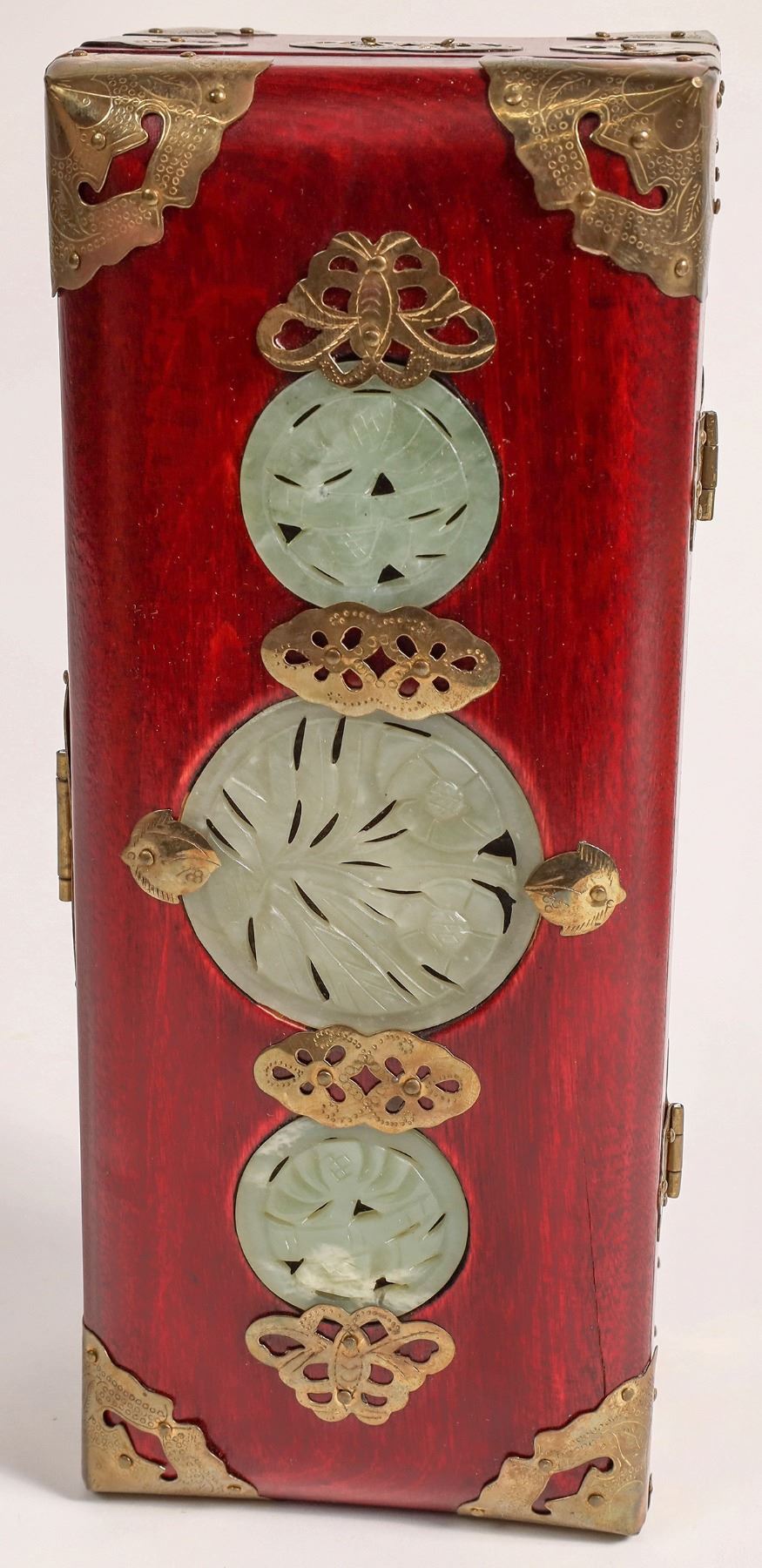 Pretty rosewood or purple heart wood hinged top jewelry box. c. 1970's, from China, in original cardboard box. Brass hardware and 3 round top inlays. 3x10x4"