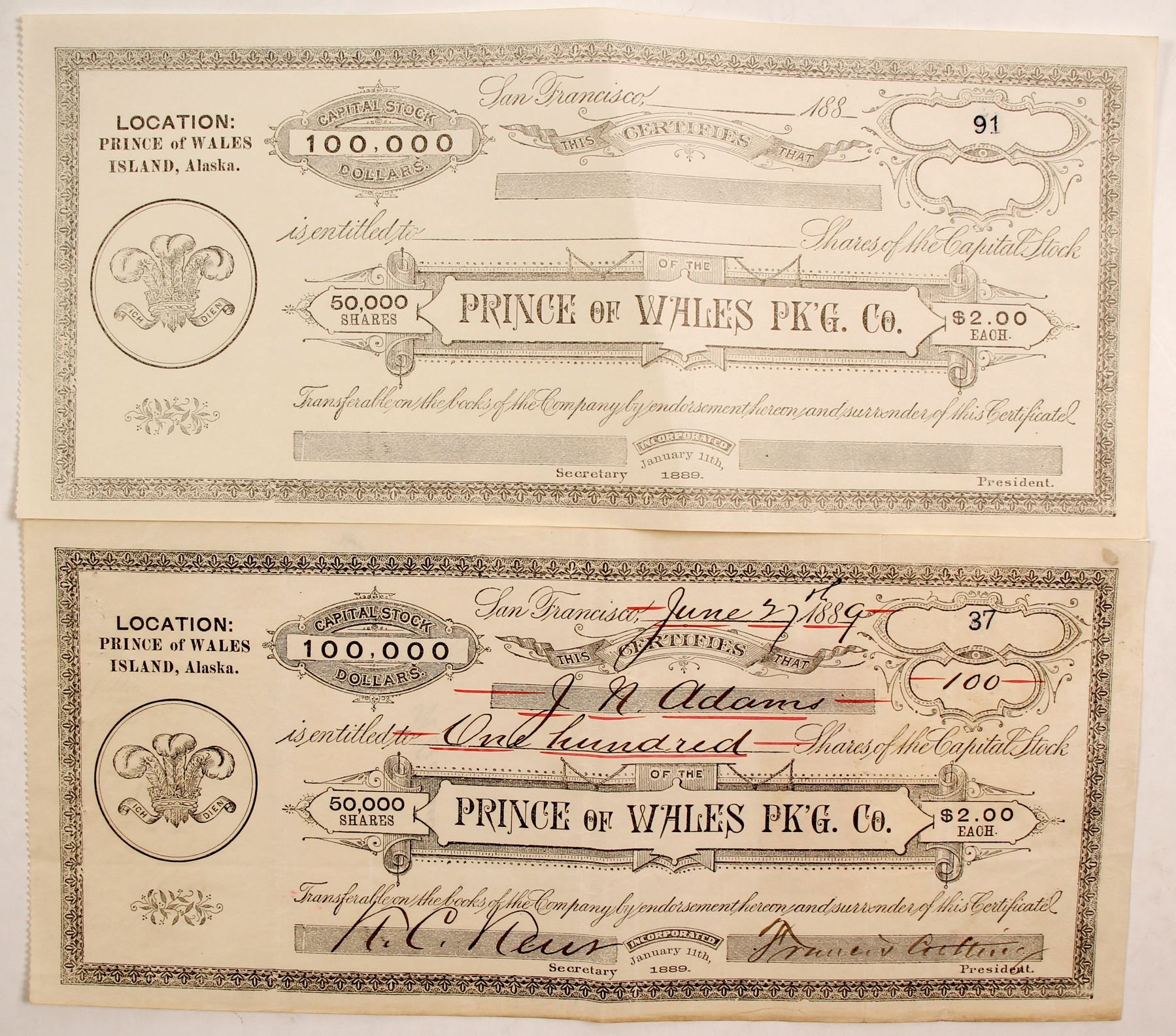Two stock certificates ( one issued and one unissued) for Prince of Wales Pk'g Co.located on Prince of Wales Island, Alaska. 1) One hundred shares of Prince of Wales Pk'g. Co., number 37 issued to J. N. Adams on June 27, 1889 with revenue stamps. 2) Unissued stock certificate for Prince of Wales Pk'g Co., number 91. Ken Prag Collection.