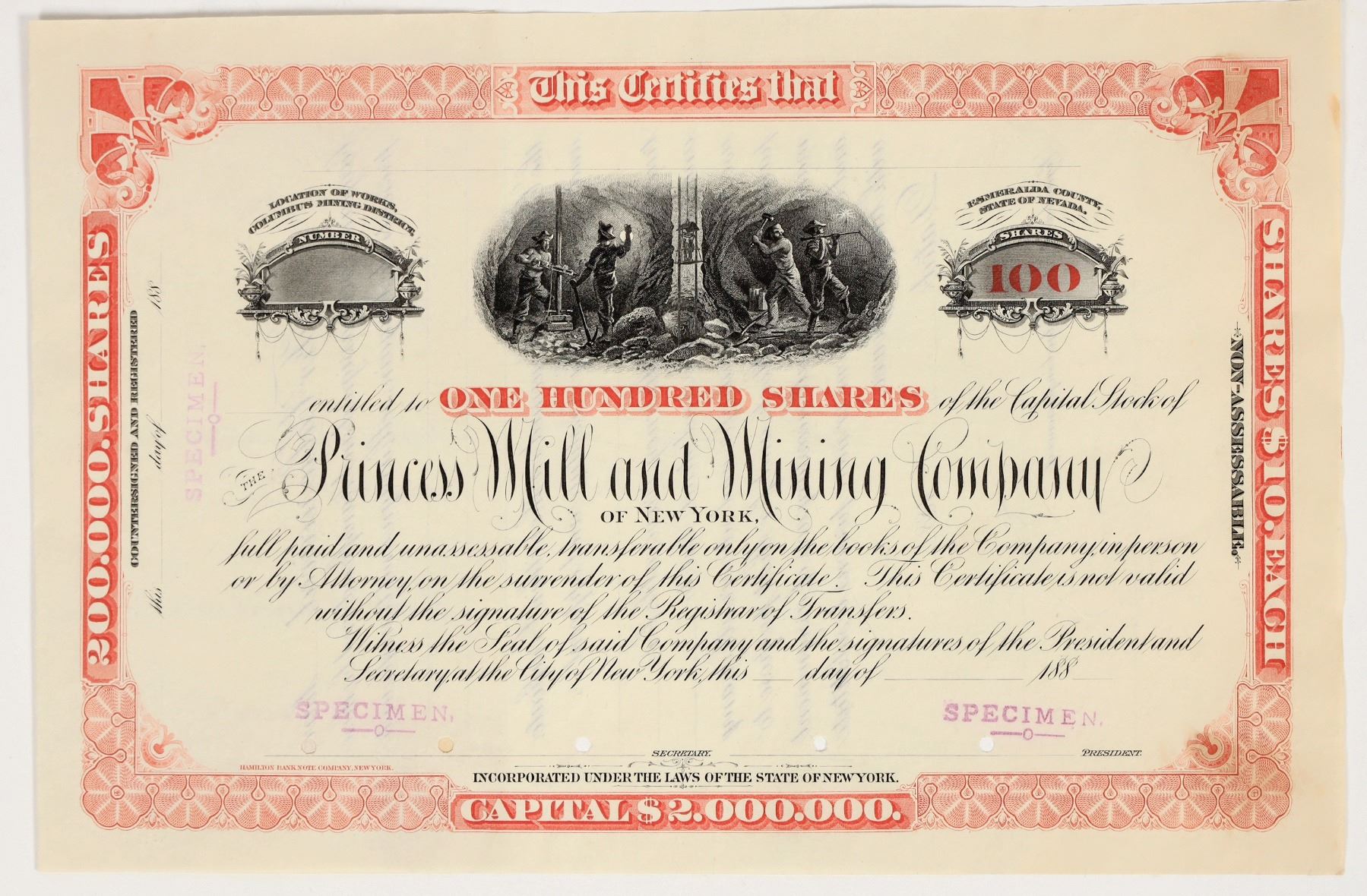 Rare specimen stock for this mine that operated at Candelaria in the Columbus Mining District, Esmeralda County. Hamilton Bank Note Co. Red border, black print, and underground mining vignette. Stamped Specimen and punch cancelled. We don't have records of selling an issued piece either. 7 x 11"