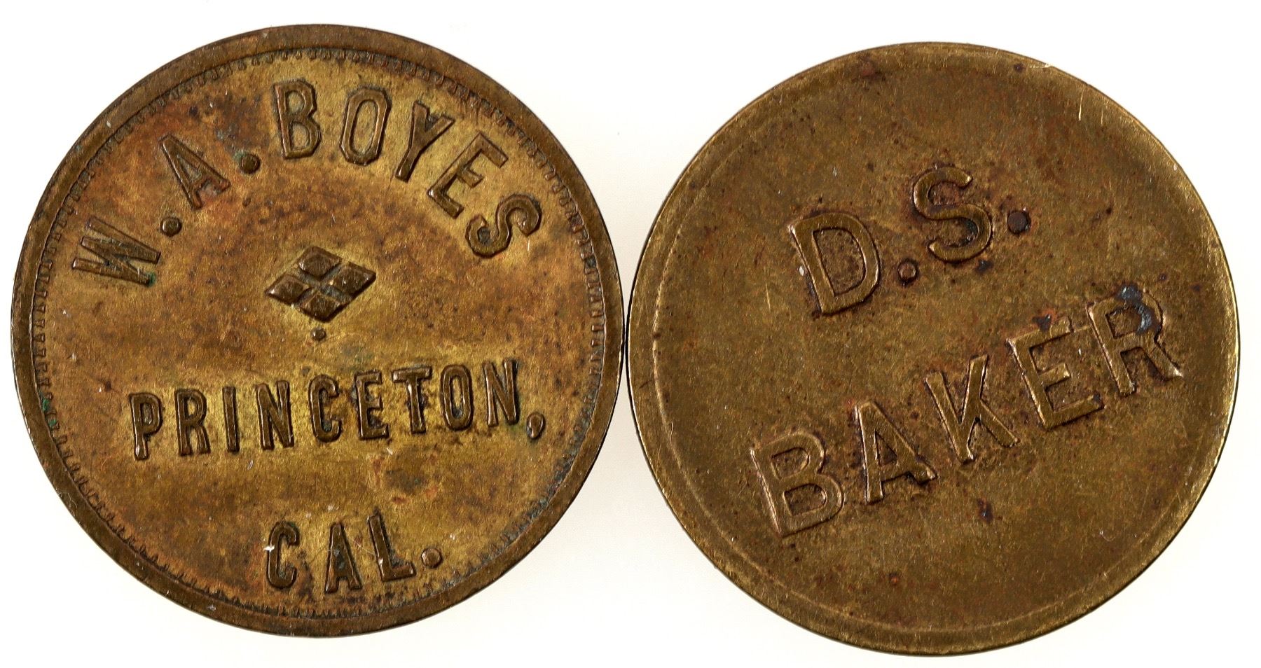 2 Princeton tokens. W A Boyes. D S Baker. Princeton California