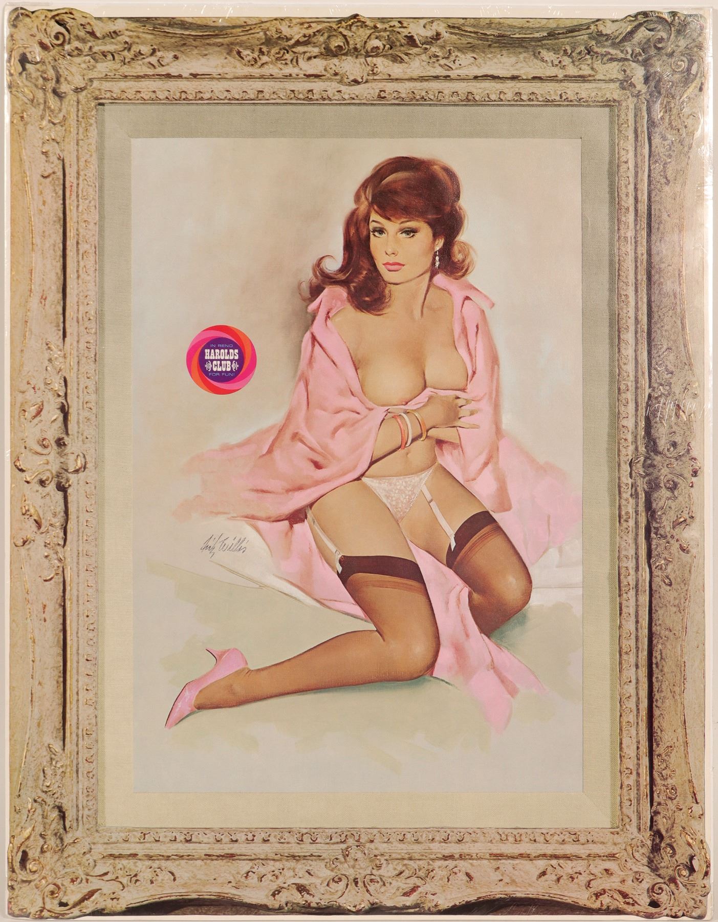 Here is a really nice item. It is a pin up girl, print. It was originally an oil paining done by Fritz Willis . He was discovered by Esquire magazine in 1946. So, they then, started a new feature called " Esquire Gallery of Glamour". He was one of the most famous, pin-up artists. This print shows a beautiful red haired woman, and was done for Harold' s Club, in Reno, Nevada. His name is on the print , but it is a faxsimilie . 26 1/8 " tall x 20 3/16" wide. Perfect Condition. This print really needs to be in a jet black frame, in your man cave...Oh Yea. (RH).