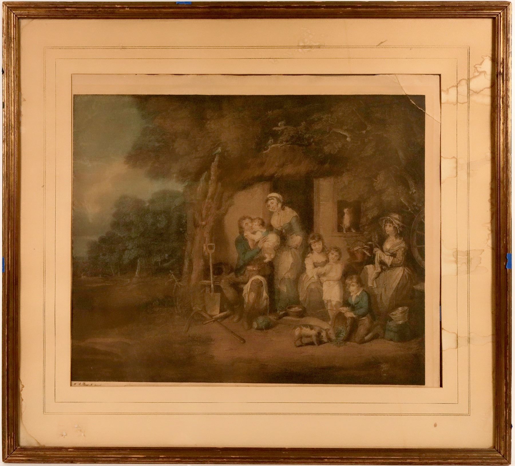 Print of a 1795 painting entitled "Saturday Evening The Husbandman's Return From Labour"by W.R. Berg and engraved by W. Nutter. Print measures 21"x 24" and has a tear on the upper right corner. Print has a temporary fix to hold it on matte to hold it in place and will need a replacement. See photos for details. 1795