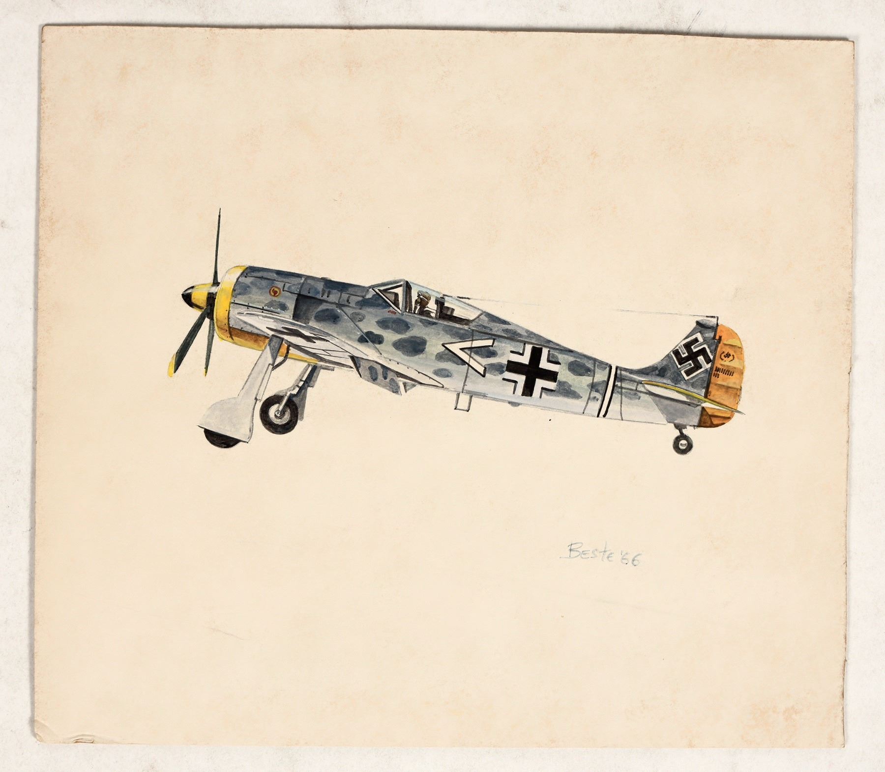 This print is of a Focke-Wulf FW-190 fighter aircraft designed by the Germans. Signed lower right "Beste '66". On artist hardboard. Ready for framing.