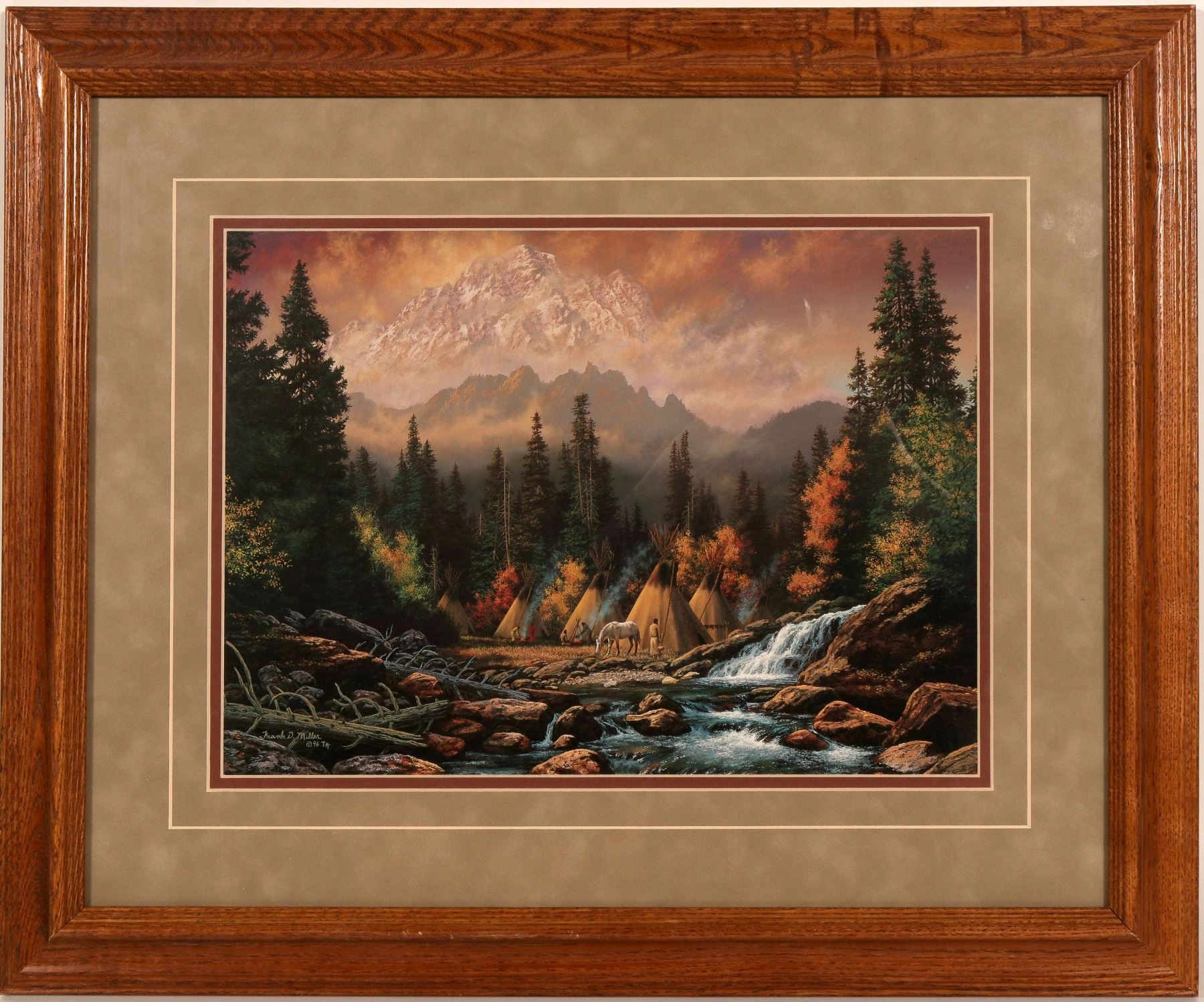 Here is a beautiful print. It may be a reproduction or later issue, as it is signed but not numbered. But, its really nice . The title is " There Was A Place". It depicts a rural part of the American West, with several native Americans near their Tee-Pee's, probably around the 1860's. The original artist was well know for his art of the American West. Very beautiful colorization , and fantastic mountains in the background. Framed in oak, 19 1/4" high x 23" in length. It " calms you " , just to look at it. ( RH).