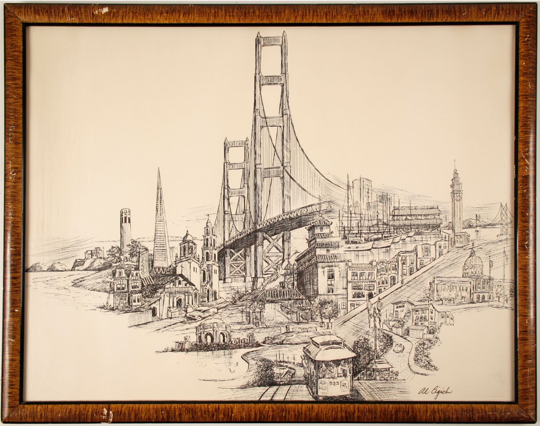 Print of San Francisco bridge, trolley car, missions,Trans-America Pyramid building.Black sketching on cream paper. Provenance: Ben-Tschavtschavadze collection of Ontario. 25" x 19.25". Slight scratching on frame, please inspect. City: San Francisco State: California Date: HWAC# 79178