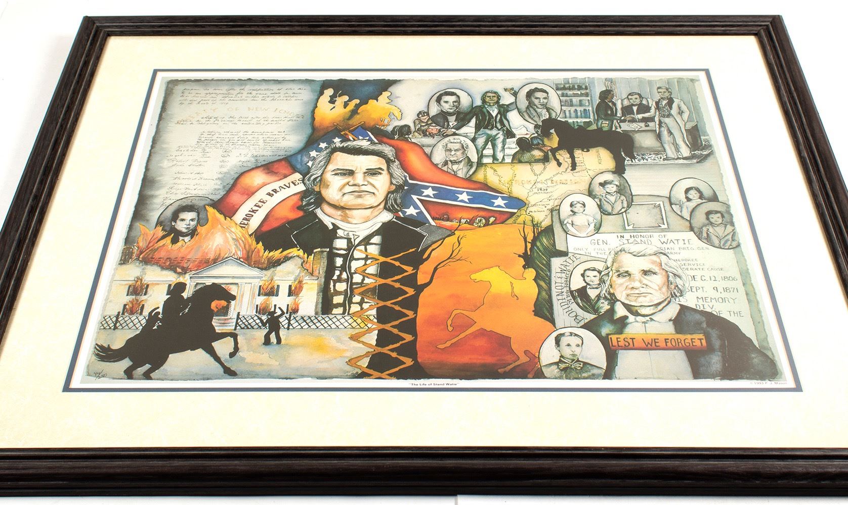 Colorful print of scenes from "The Life of Stand Watie". Copyright 1993, P.J. Mason. Inset of Gen. Stand Watie and appears to be insets of 4 small children, and inset of woman. It reads Cherokee Braves at left of print and burning home at bottom left. Also known as Standhope Oowatie, Degataga, and Isaac S. Watie, he was a leader of the Cherokee Nation and a brigadier general of the Confederate States Army during the Civil War. From Wikipedia. No condition issues. Frame is 34" x 26"; Print is 19.5" x 23". (Al Adams Gold Rush Memorabilia Collection) Date: Location: HWAC# 55132