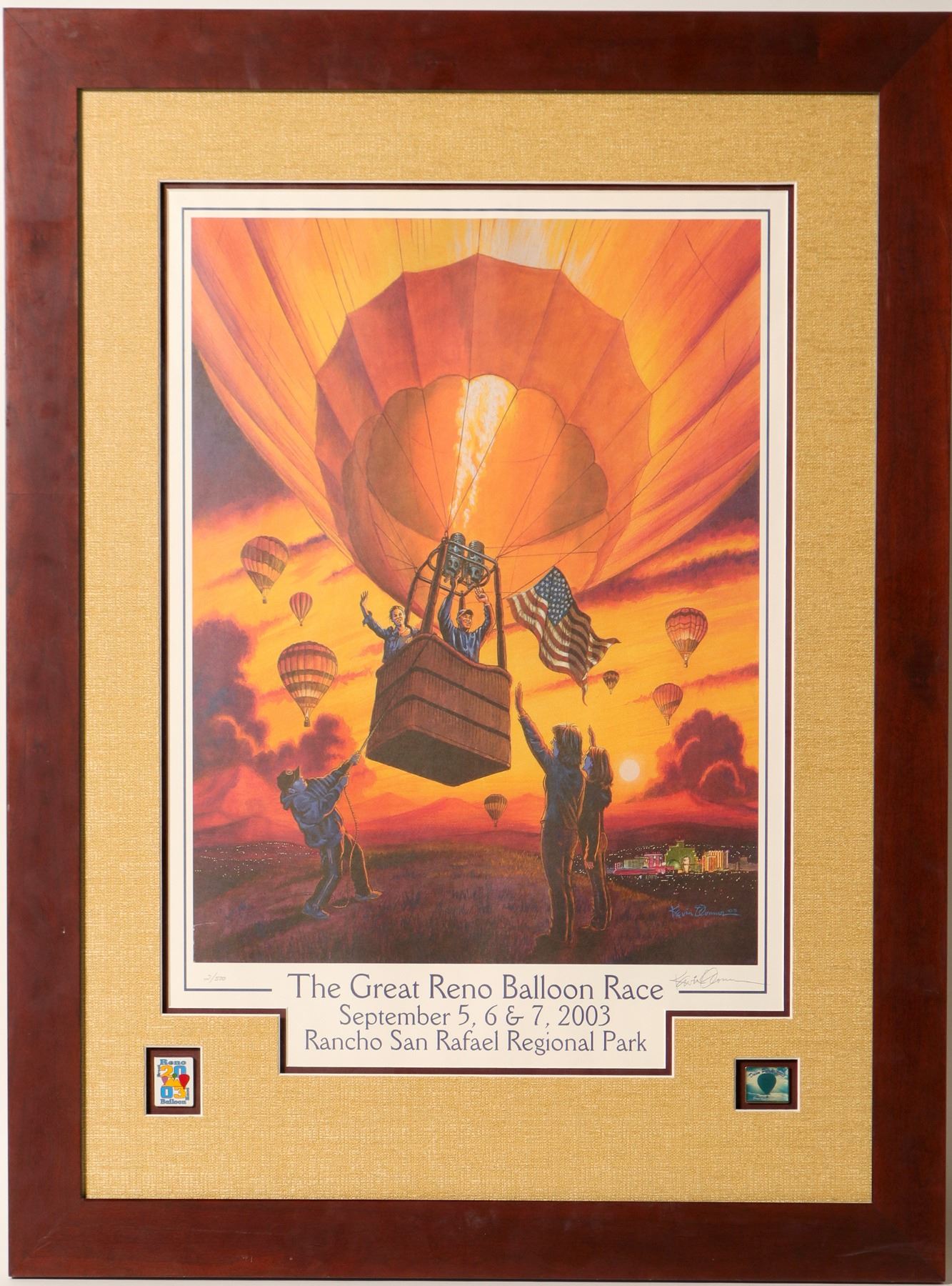 Colorful print of 2003 Balloon Race in Reno, Nv. Beautiful frame, signed by artist Kevin last name illegible. This print is of the morning ascension of the balloon. Double matted, Numbered 2/500. Ready to hang on wall very nice condition. 29.75" x 37".