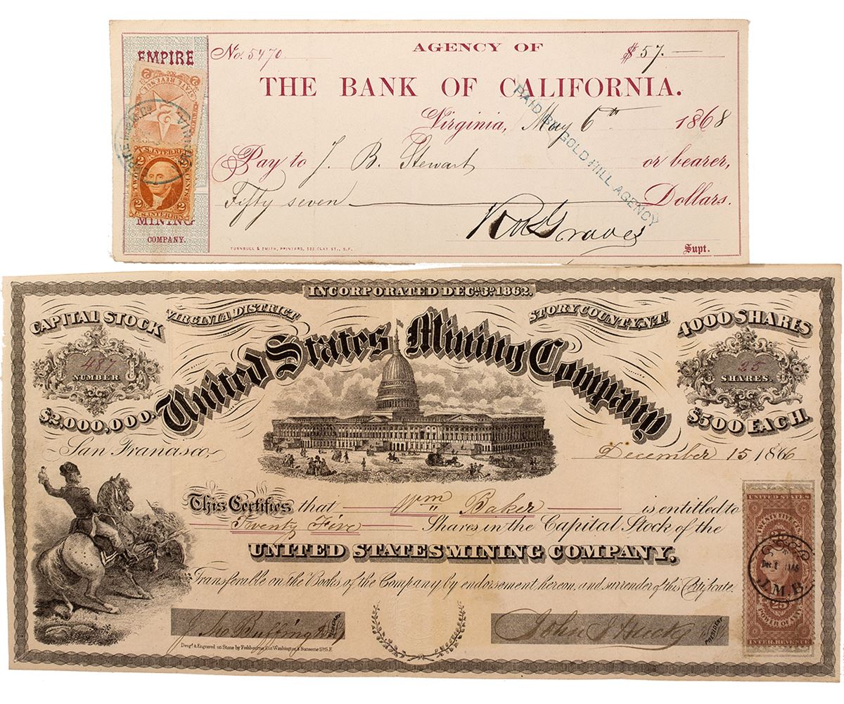 Lot of 2. 1. The first document is a stock certificate of the United States Mining Company. No. 487 is made out to William Baker for 25 shares on 15 December 1866 and signed by company officers, J. Buffington and John I. Hucky. A tied, red, U. S. 25 cent power of attorney, R 48, R 4, revenue stamp is affixed to the lower right side. Both items are in excellent condition. 2. No. 5470 drawn on The Bank of California account of the Empire Mine. Made out to J. B. Stewart by R. W. Graves, Superintendent on 6 May 1868 for $57.00. Two adhesive stamps on left: orange, NV, 2 cent revenue stamp, perf., orange, 2 cent R 15, R 2, U. S., revenue stamp, perf. Cancelled but not tied.